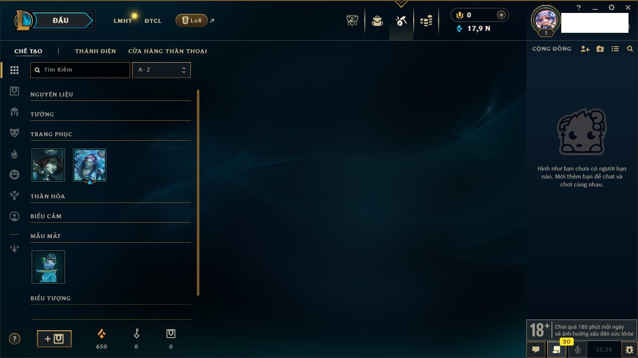 Rank Đơn: Chưa Rank Khung: Chưa có khung Tướng: 157 - Còn 51905 THX Trang Phục: 3 Rank ĐTCL: Chưa Rank Linh Thú: 175
