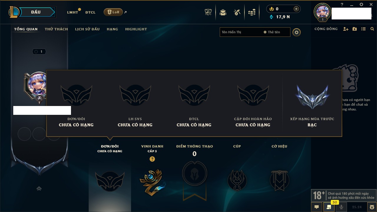 Rank Đơn: Chưa Rank Khung: Đồng Tướng: 145 - Còn 4341 THX Trang Phục: 30 Rank ĐTCL: Chưa Rank Linh Thú: 82