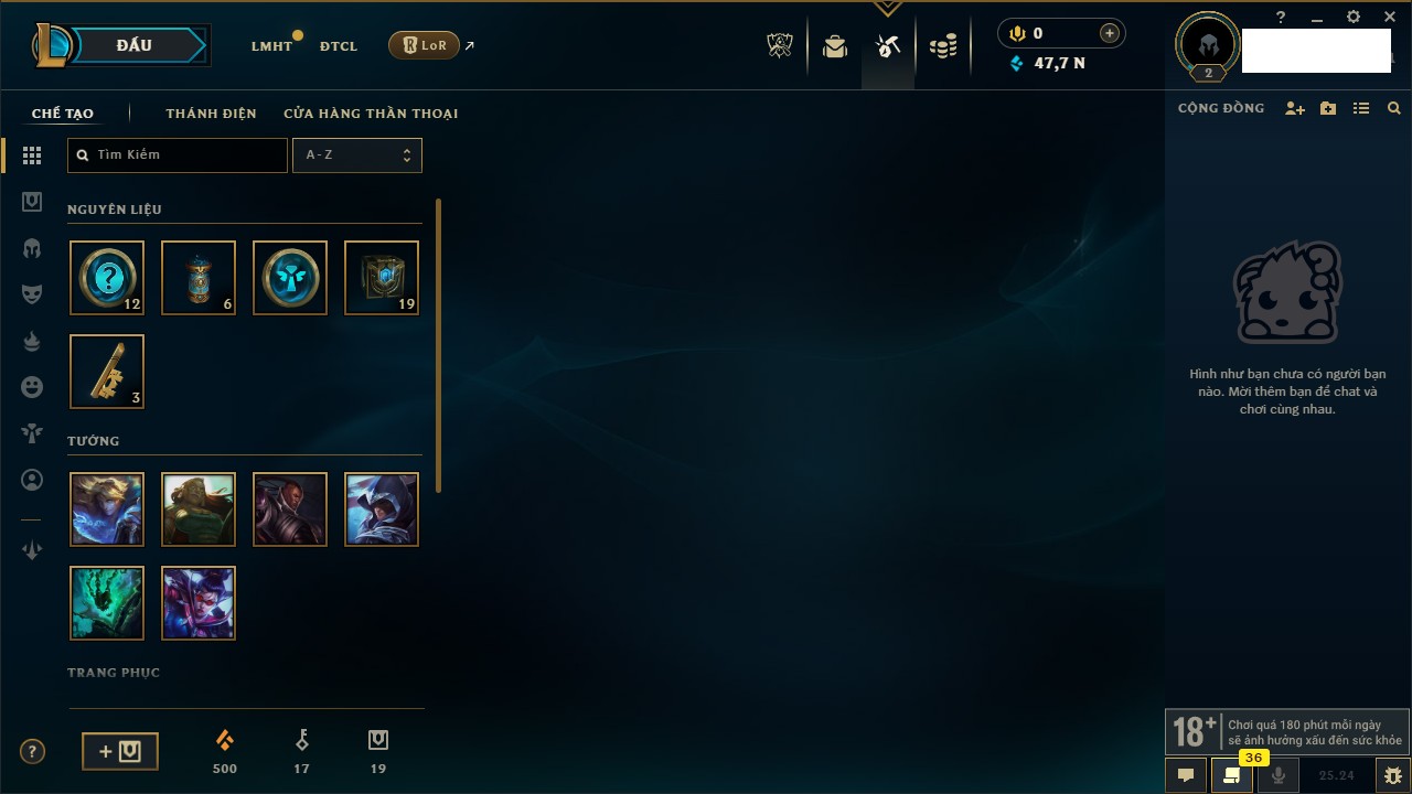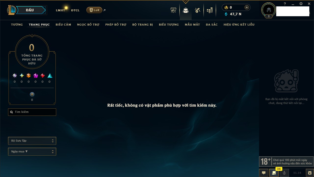 Rank Đơn: Chưa Rank Khung: Chưa có khung Tướng: 157 - Còn 51905 THX Trang Phục: 3 Rank ĐTCL: Chưa Rank Linh Thú: 175