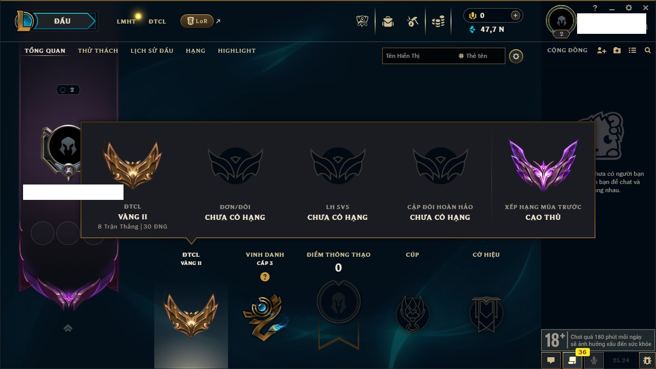 Rank Đơn: Chưa Rank Khung: Đồng Tướng: 171 - Còn 82665 THX Trang Phục: 45 Rank ĐTCL: Chưa Rank Linh Thú: 95