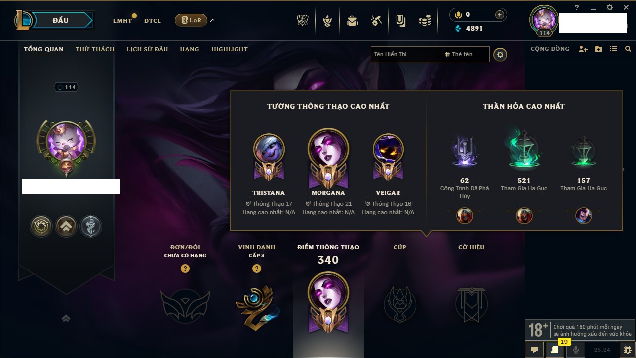 Rank Đơn: Chưa rank mùa nàoKhung: Chưa có khungTướng: 157 - Còn 12765 THXTrang Phục: 3Rank ĐTCL: Chưa RankLinh Thú: 78