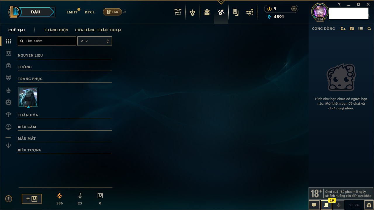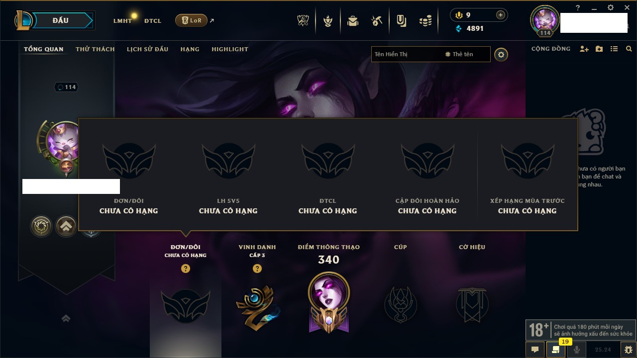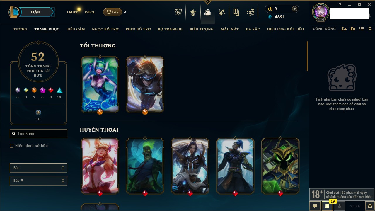 Rank Đơn: Chưa rank mùa nàoKhung: Chưa có khungTướng: 166 - Còn 3090 THXTrang Phục: 9Rank ĐTCL: Chưa RankLinh Thú: 125