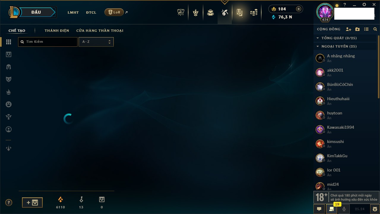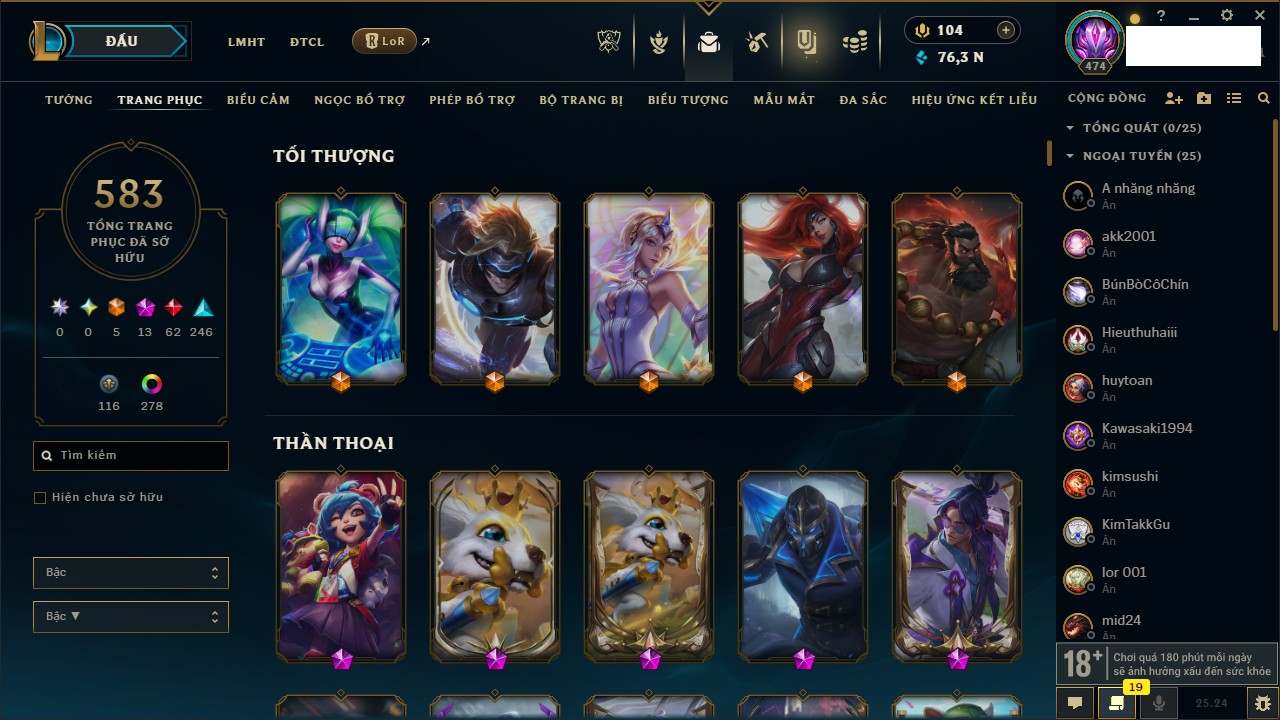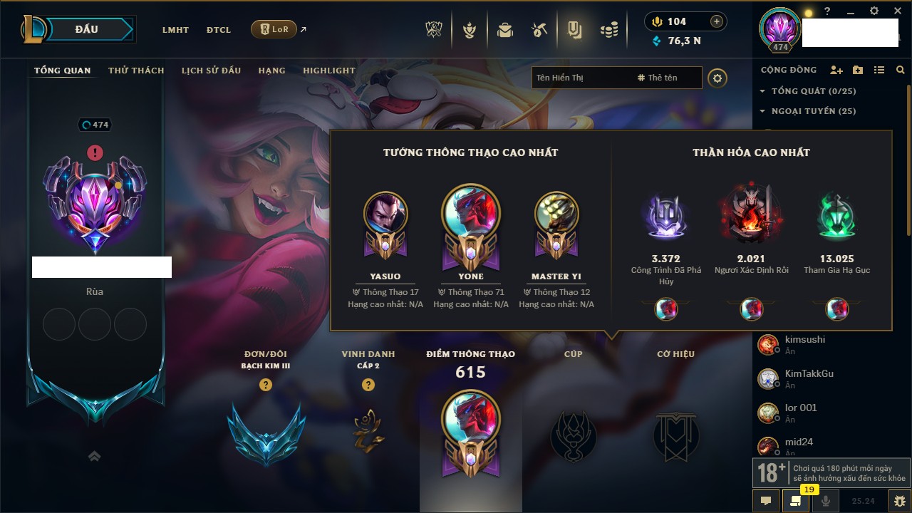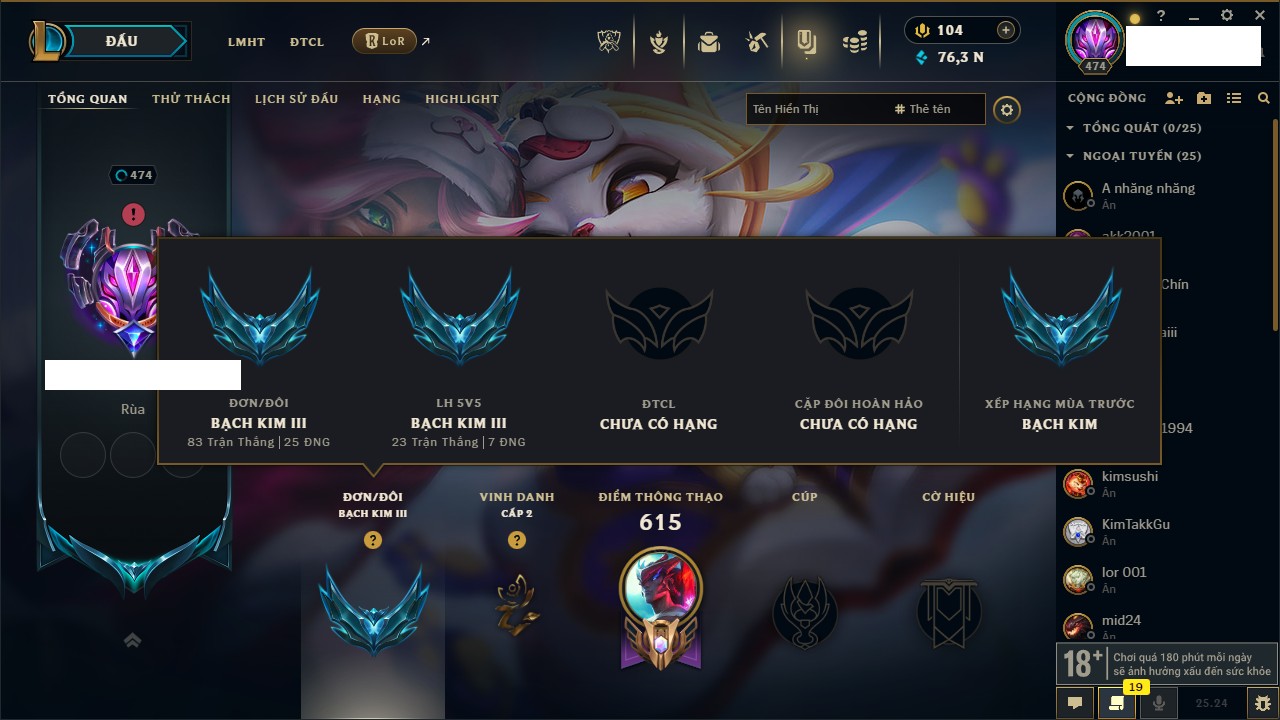 Rank Đơn: Bạch Kim III Khung: Bạch kim Tướng: 172 - Còn 76349 THX Trang Phục: 583 Rank ĐTCL: Chưa Rank Linh Thú: 278