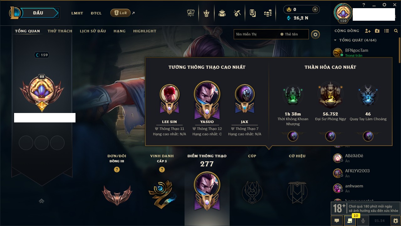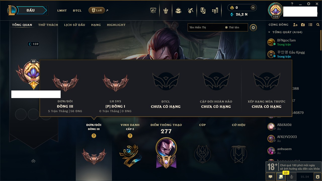 Rank Đơn: Đồng III Khung: Chưa có khung Tướng: 165 - Còn 26276 THX Trang Phục: 61 Rank ĐTCL: Chưa Rank Linh Thú: 32