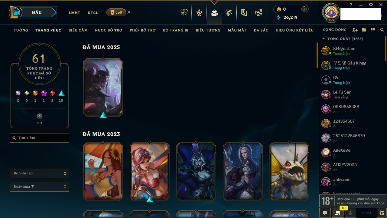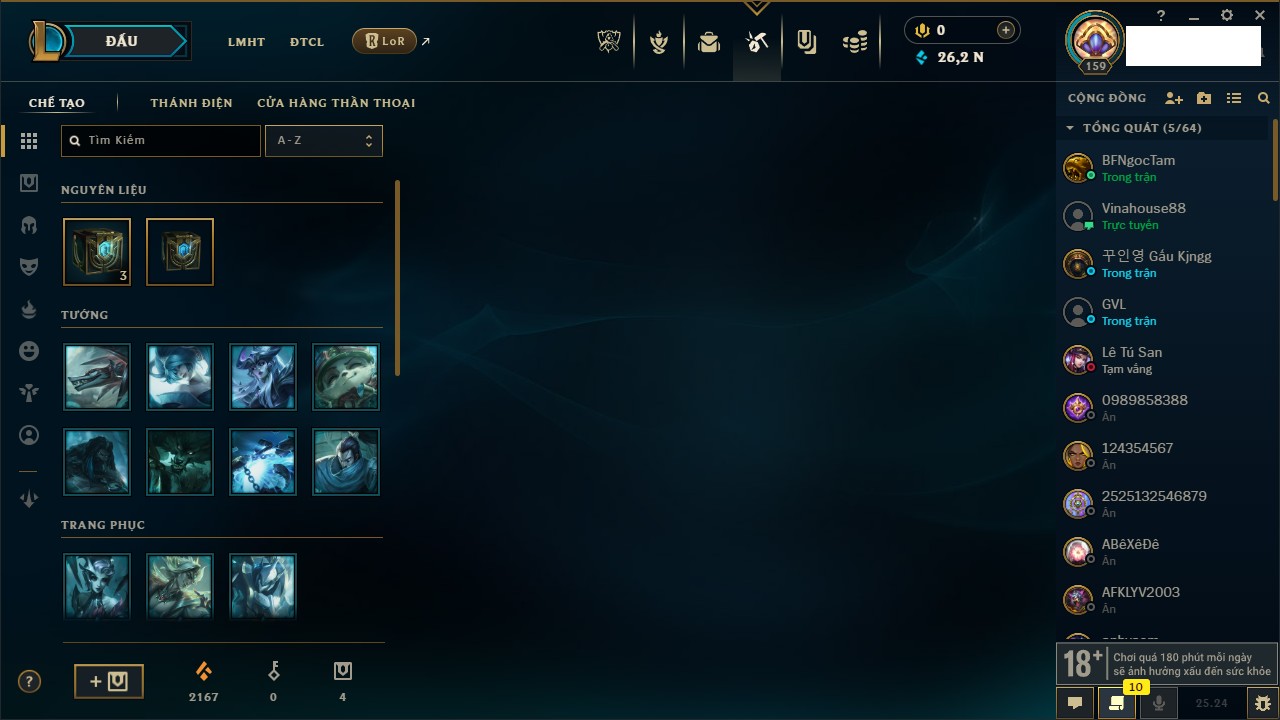 Rank Đơn: Chưa rank mùa nào Khung: Chưa có khung Tướng: 166 - Còn 9615 THX Trang Phục: 26 Rank ĐTCL: Chưa Rank Linh Thú: 27