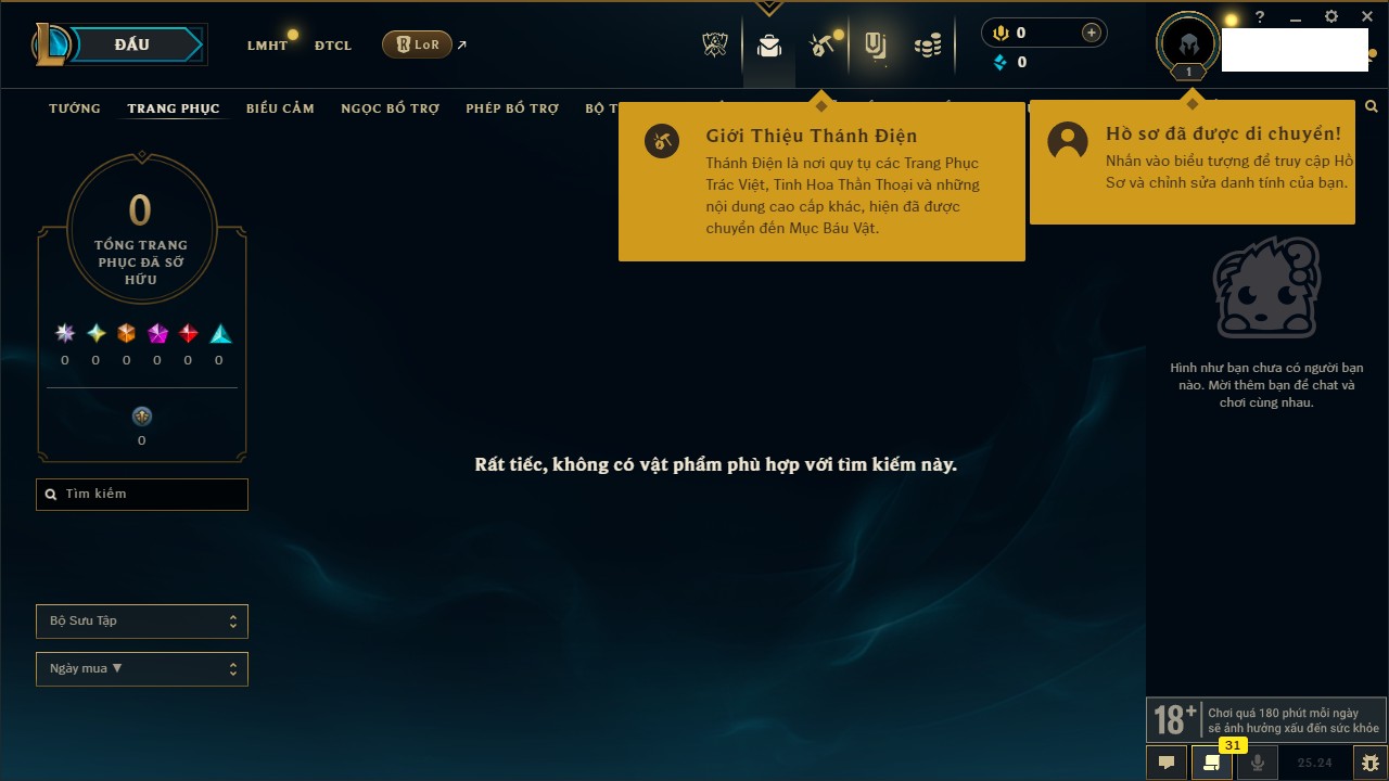 Rank Đơn: Chưa Rank Khung: Chưa có khung Tướng: 171 - Còn 52162 THX Trang Phục: 78 Rank ĐTCL: Chưa Rank Linh Thú: 145