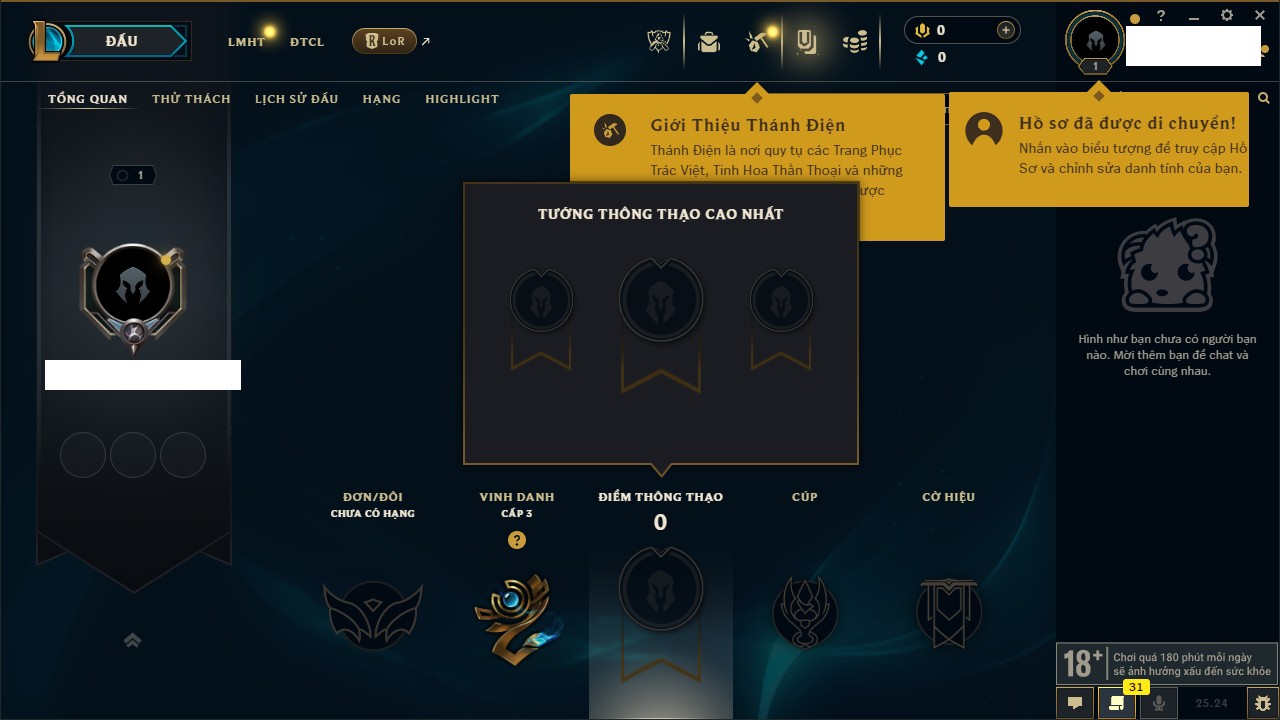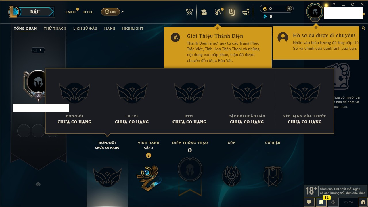 Rank Đơn: Chưa RankKhung: Bạch kimTướng: 172 - Còn 81 THXTrang Phục: 226Rank ĐTCL: Chưa RankLinh Thú: 193