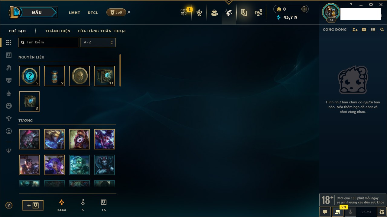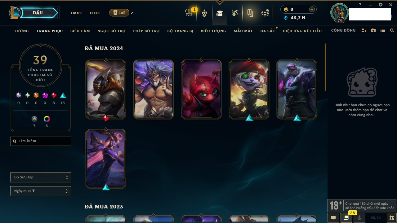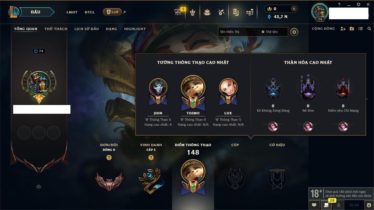 Rank Đơn: Sắt IIIKhung: Chưa có khungTướng: 77 - Còn 8133 THXTrang Phục: 11Rank ĐTCL: Bạch Kim IVLinh Thú: 108
