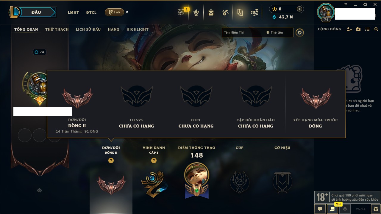 Rank Đơn: Bạc IVKhung: BạcTướng: 76 - Còn 1316 THXTrang Phục: 14Rank ĐTCL: Vàng IILinh Thú: 96