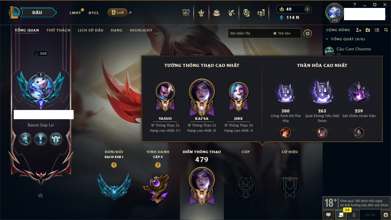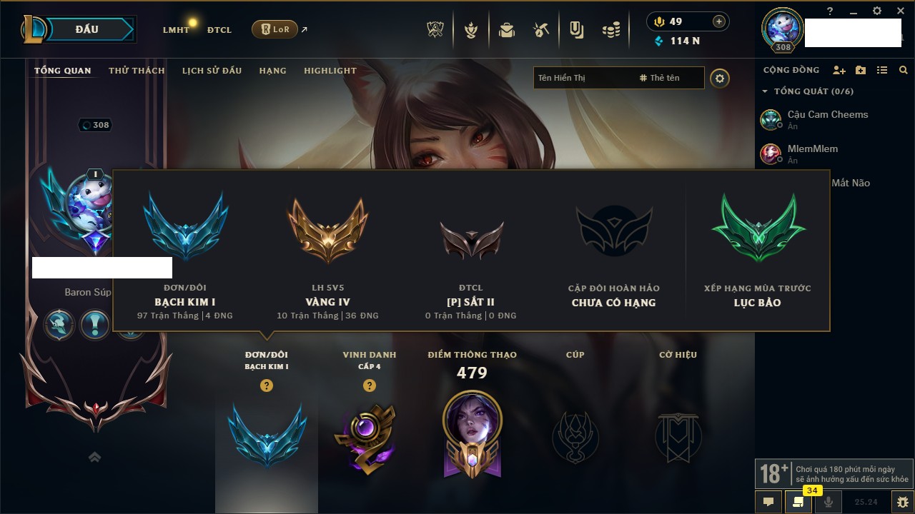 Rank Đơn: Bạc IIKhung: Chưa có khungTướng: 145 - Còn 12230 THXTrang Phục: 183Rank ĐTCL: Chưa RankLinh Thú: 71