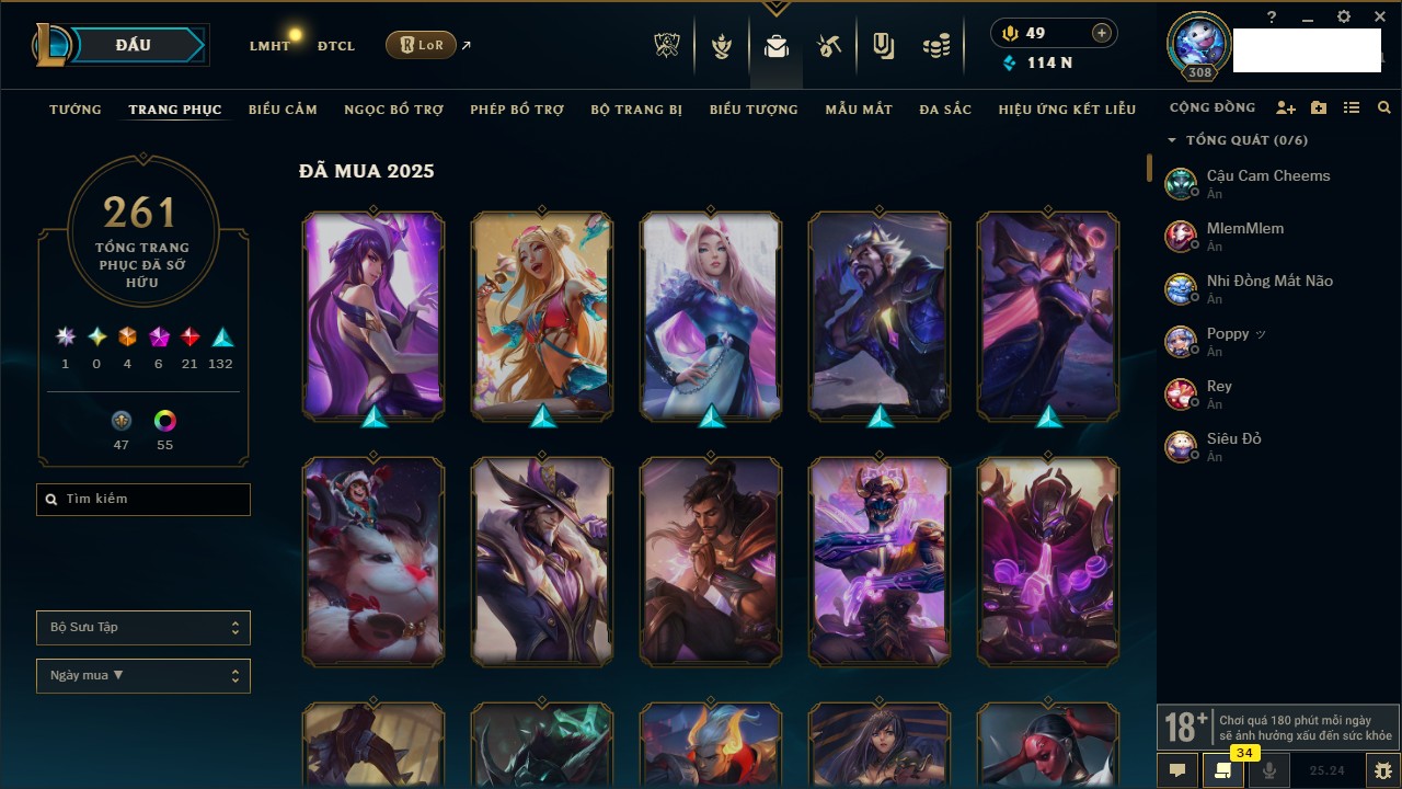 Rank Đơn: Chưa RankKhung: Chưa có khungTướng: 169 - Còn 43188 THXTrang Phục: 205Rank ĐTCL: Chưa RankLinh Thú: 259