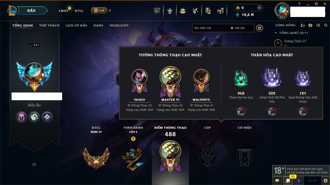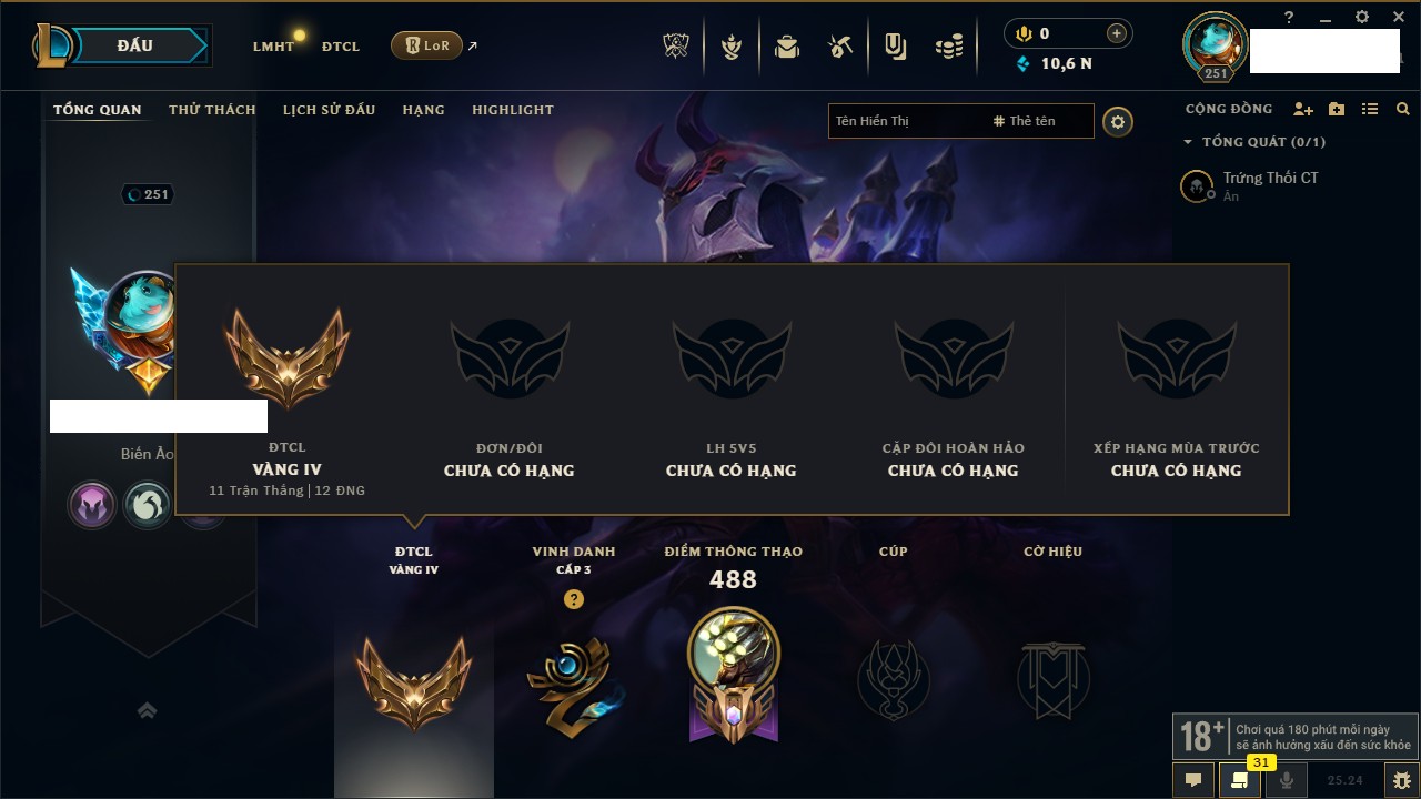 Rank Đơn: Chưa Rank Khung: Chưa có khung Tướng: 156 - Còn 10695 THX Trang Phục: 153 Rank ĐTCL: Vàng IV Linh Thú: 56