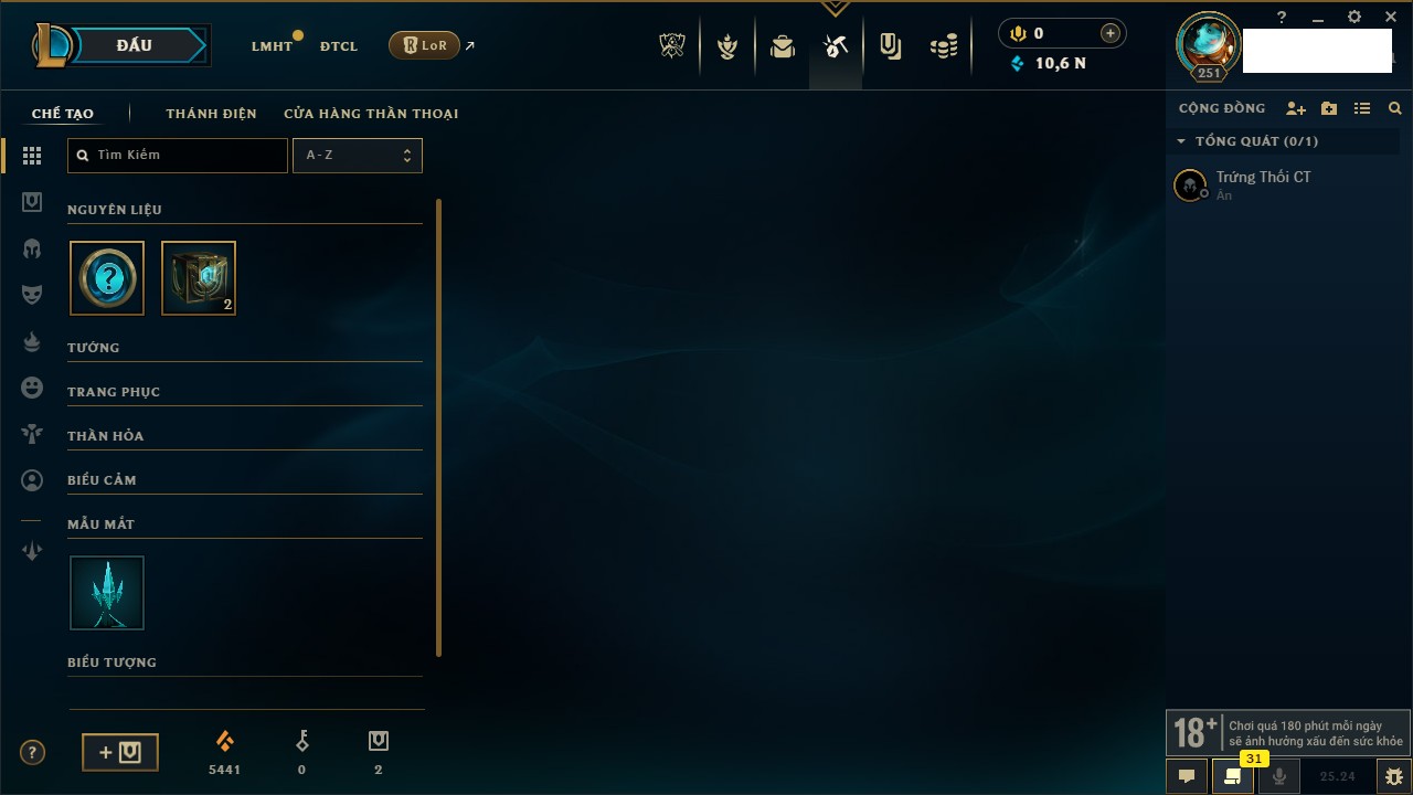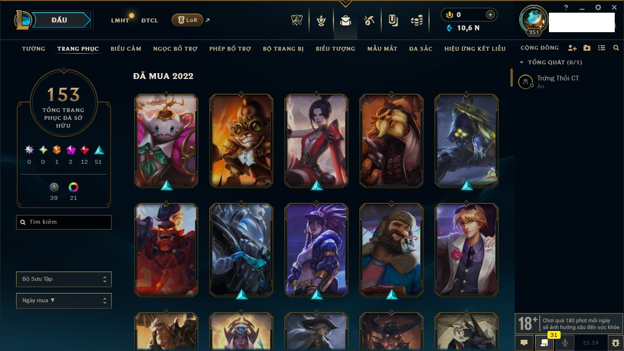 Rank Đơn: Chưa rank mùa nào Khung: Chưa có khung Tướng: 170 - Còn 3409 THX Trang Phục: 54 Rank ĐTCL: Chưa Rank Linh Thú: 170