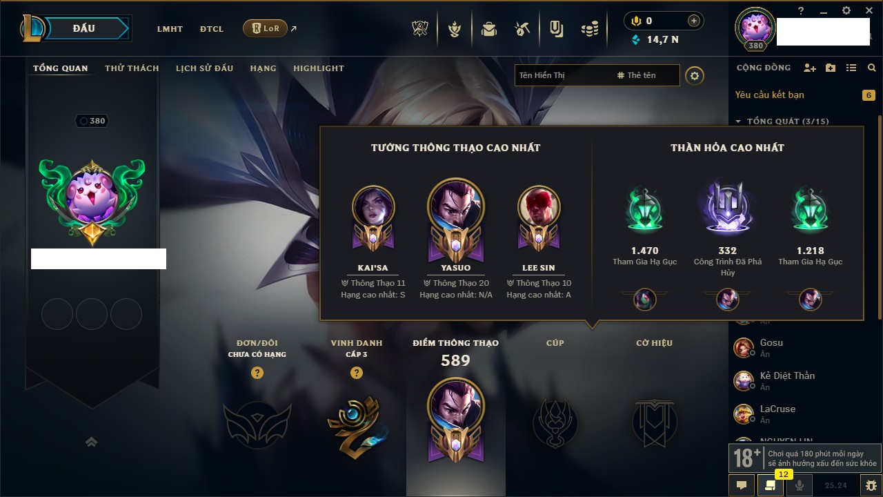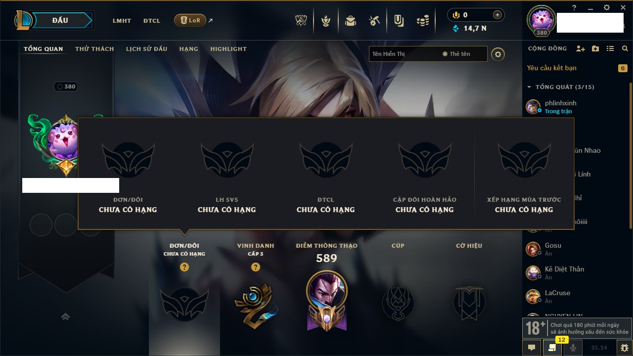 Rank Đơn: Chưa RankKhung: Bạch kimTướng: 172 - Còn 81 THXTrang Phục: 226Rank ĐTCL: Chưa RankLinh Thú: 193