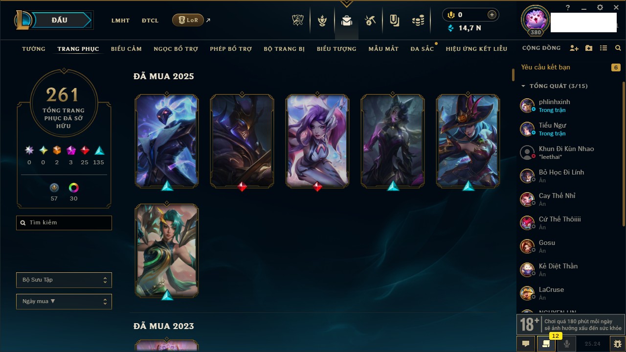 Rank Đơn: Chưa RankKhung: Bạch kimTướng: 170 - Còn 146400 THXTrang Phục: 225Rank ĐTCL: Chưa RankLinh Thú: 134