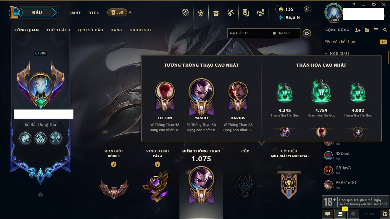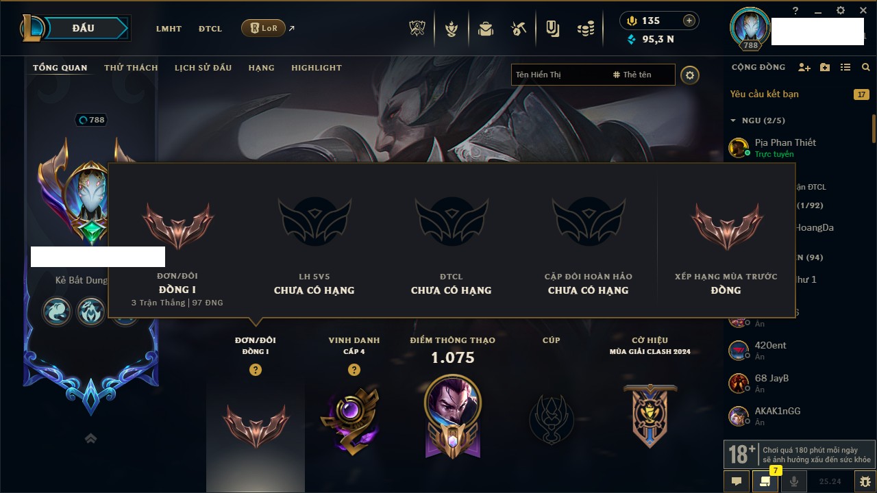 Rank Đơn: Sắt IKhung: Chưa có khungTướng: 171 - Còn 89600 THXTrang Phục: 513Rank ĐTCL: Chưa RankLinh Thú: 57