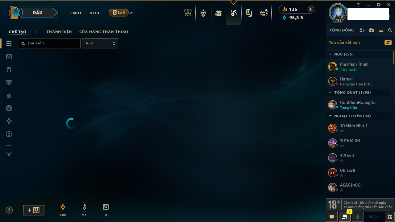 Rank Đơn: Chưa RankKhung: Chưa có khungTướng: 170 - Còn 72514 THXTrang Phục: 202Rank ĐTCL: Chưa RankLinh Thú: 191