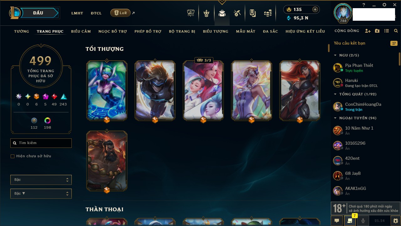 Rank Đơn: Vàng IVKhung: VàngTướng: 172 - Còn 530040 THXTrang Phục: 251Rank ĐTCL: Chưa RankLinh Thú: 70