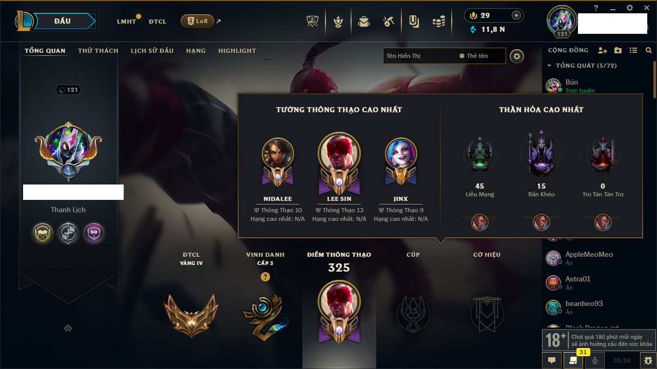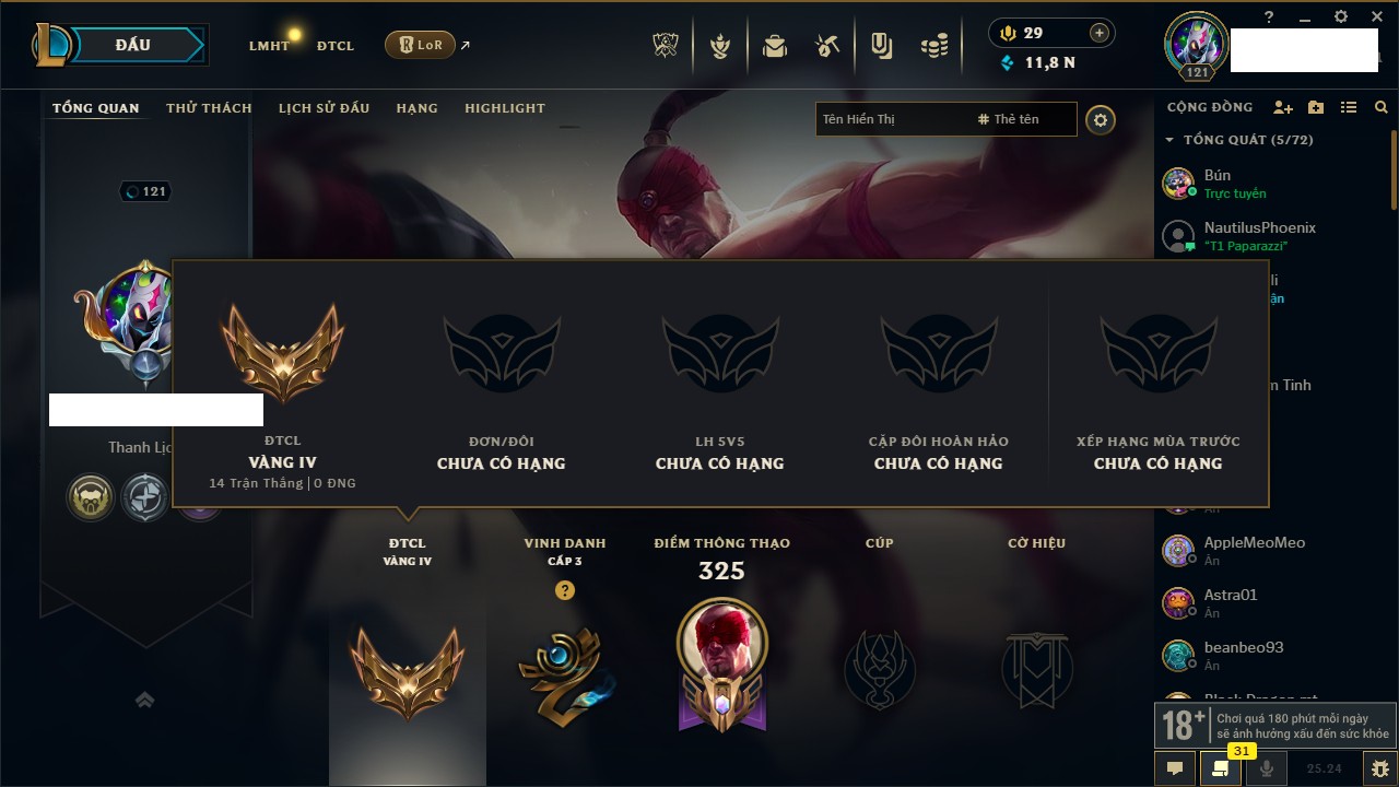 Rank Đơn: Vàng IVKhung: VàngTướng: 171 - Còn 48721 THXTrang Phục: 171Rank ĐTCL: Chưa RankLinh Thú: 27