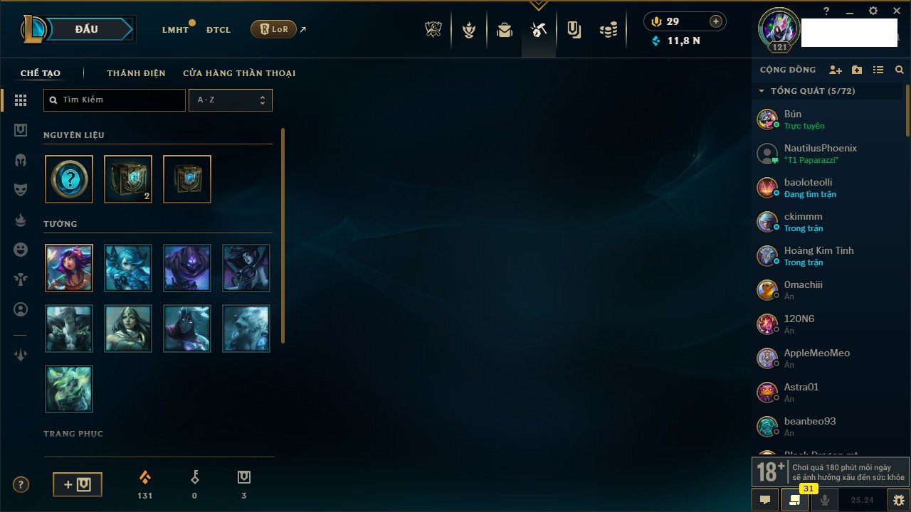 Rank Đơn: Lục Bảo IVKhung: Chưa có khungTướng: 169 - Còn 6488 THXTrang Phục: 185Rank ĐTCL: Chưa RankLinh Thú: 86