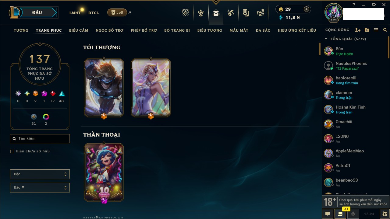 Rank Đơn: Vàng IVKhung: BạcTướng: 166 - Còn 180925 THXTrang Phục: 163Rank ĐTCL: Chưa RankLinh Thú: 67