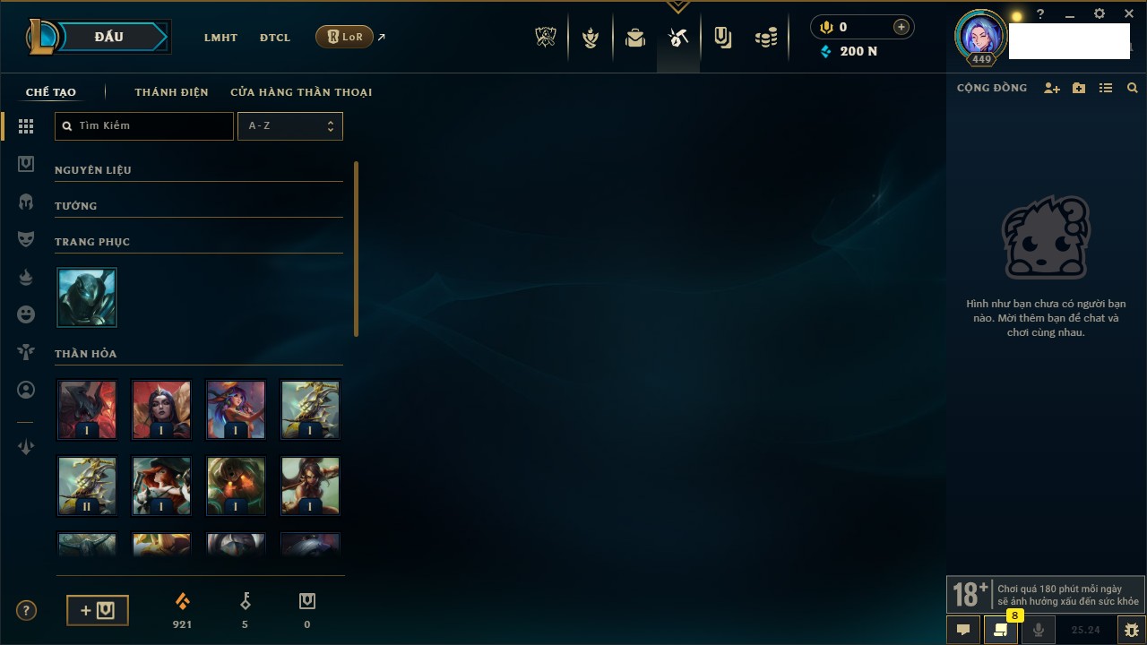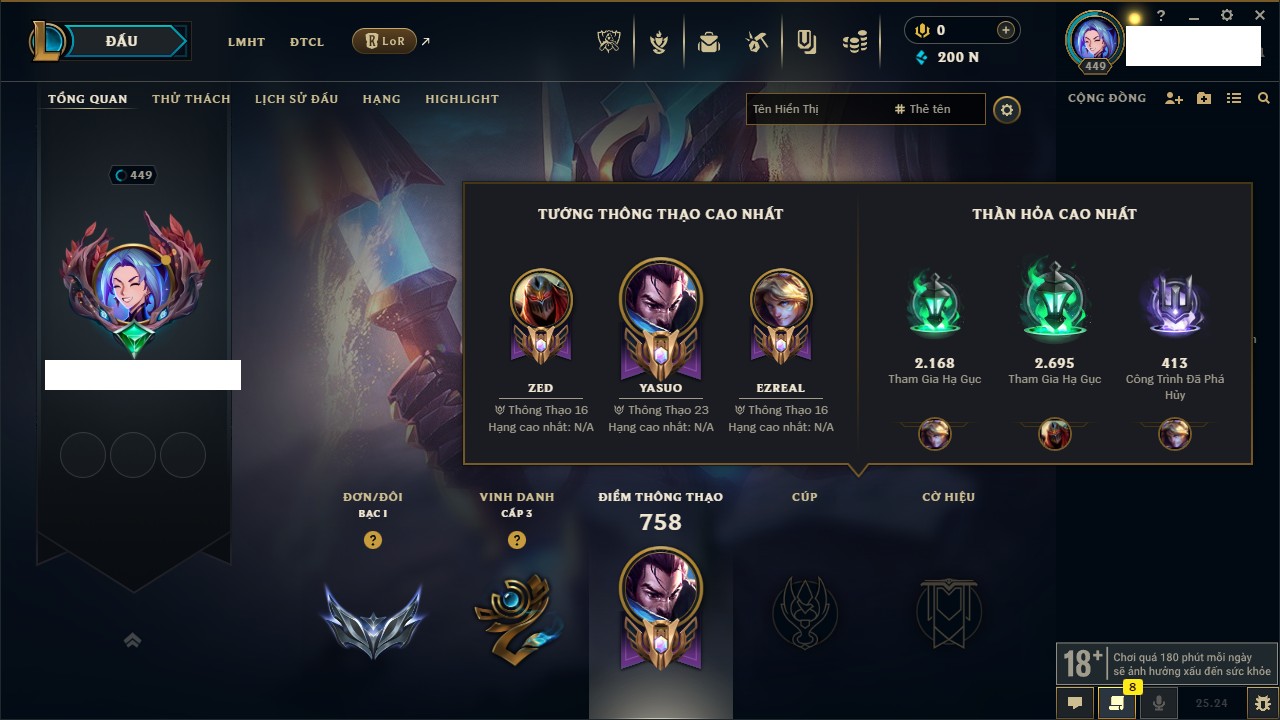 Rank Đơn: Chưa RankKhung: Bạch kimTướng: 171 - Còn 182788 THXTrang Phục: 158Rank ĐTCL: Chưa RankLinh Thú: 56