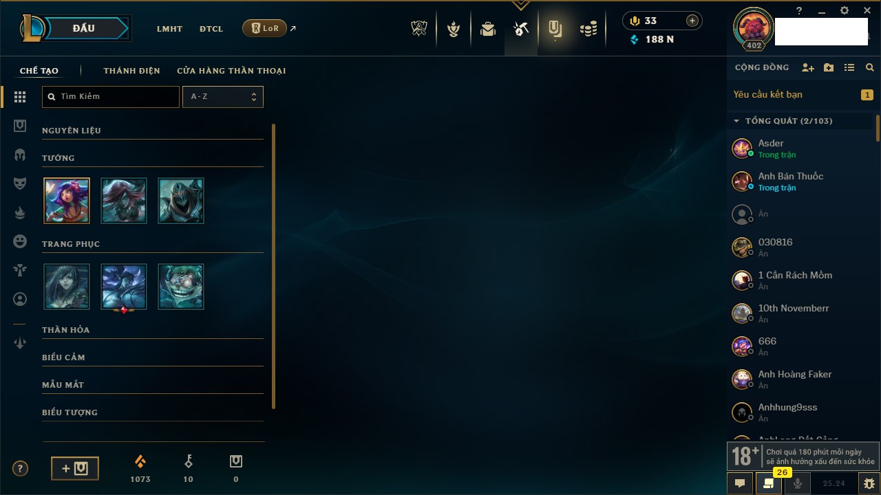 Rank Đơn: Chưa Rank Khung: Chưa có khung Tướng: 157 - Còn 51905 THX Trang Phục: 3 Rank ĐTCL: Chưa Rank Linh Thú: 175