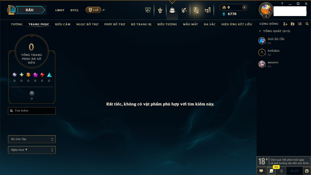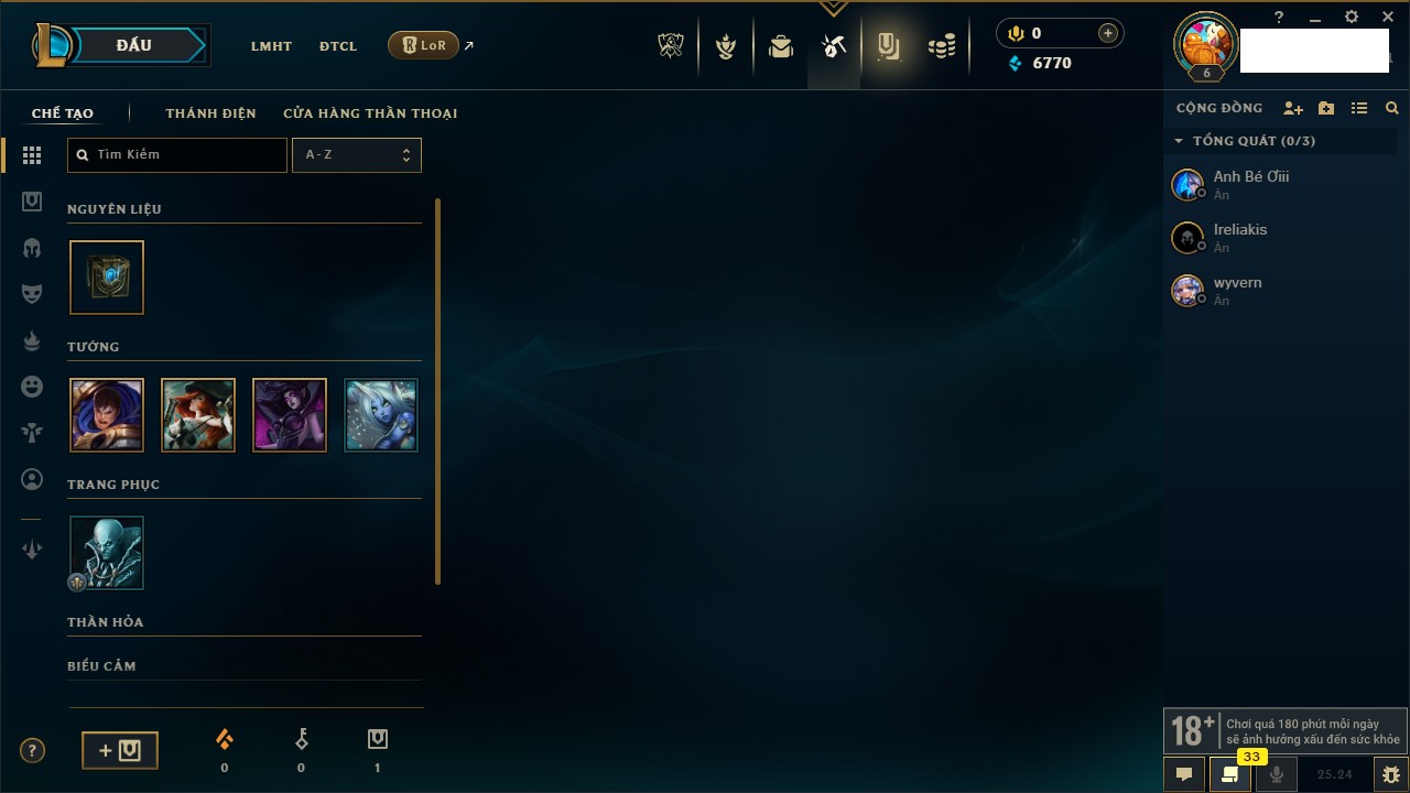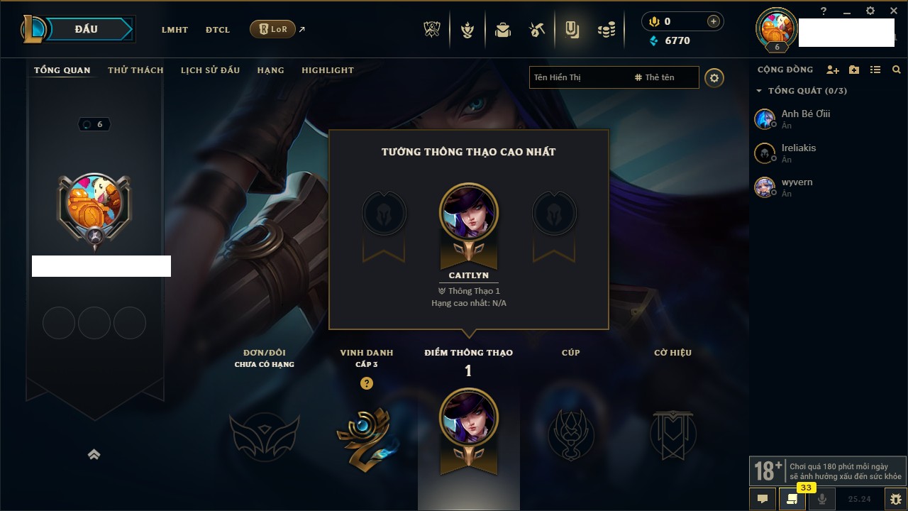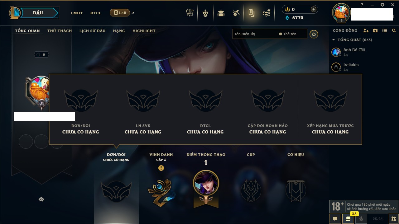 Rank Đơn: Chưa rank mùa nàoKhung: Chưa có khungTướng: 3 - Còn 6770 THXTrang Phục: 0Rank ĐTCL: Chưa RankLinh Thú: 13