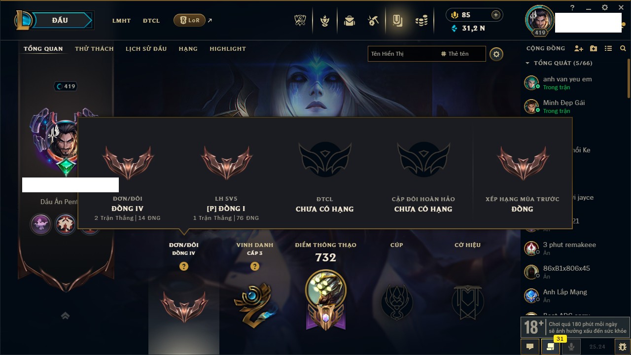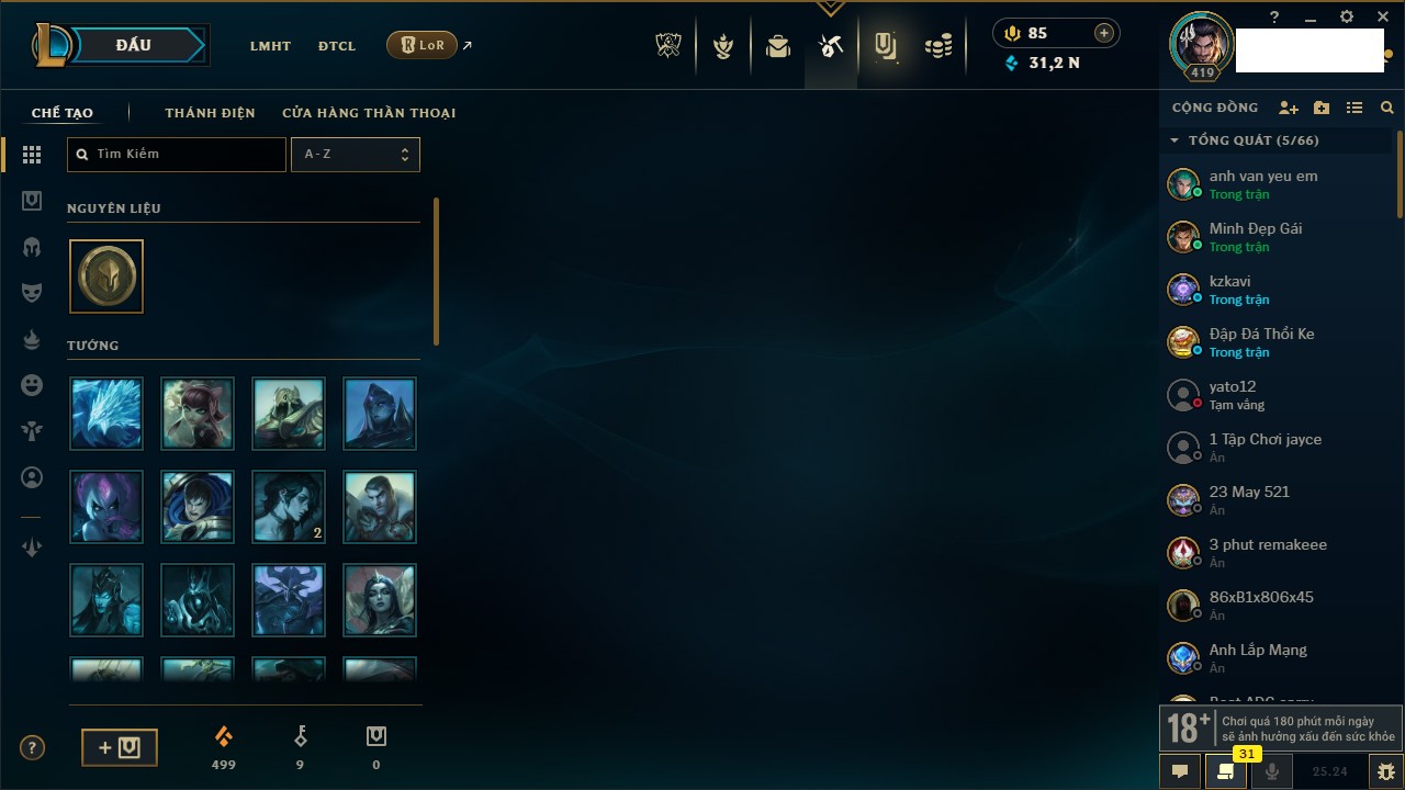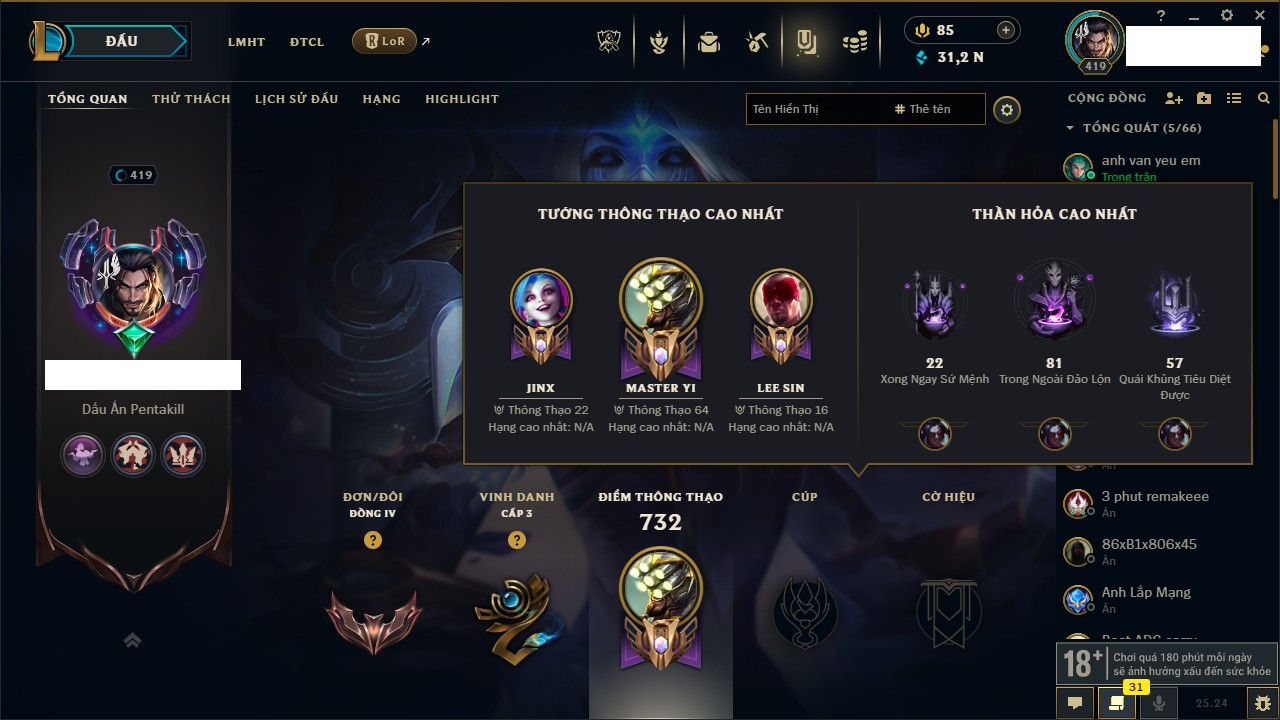 Rank Đơn: Chưa RankKhung: Chưa có khungTướng: 171 - Còn 164047 THXTrang Phục: 173Rank ĐTCL: Chưa RankLinh Thú: 77