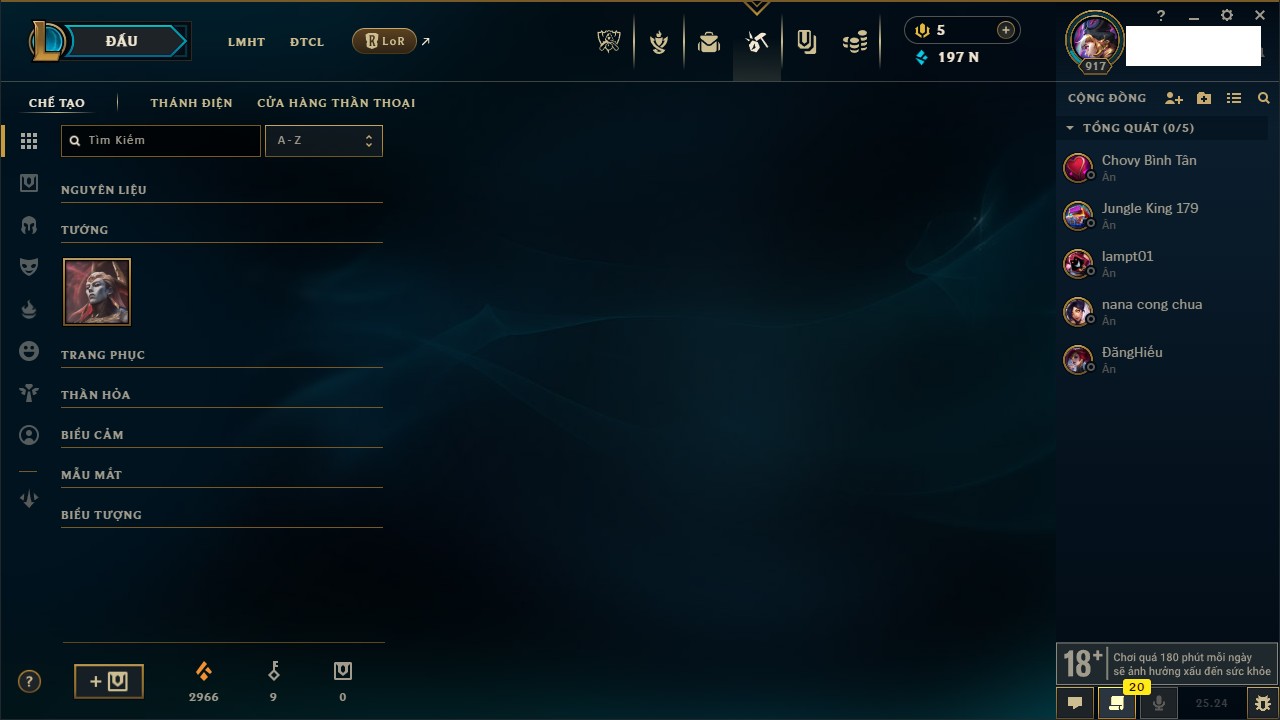 Rank Đơn: Chưa RankKhung: Chưa có khungTướng: 171 - Còn 827961 THXTrang Phục: 193Rank ĐTCL: Chưa RankLinh Thú: 63