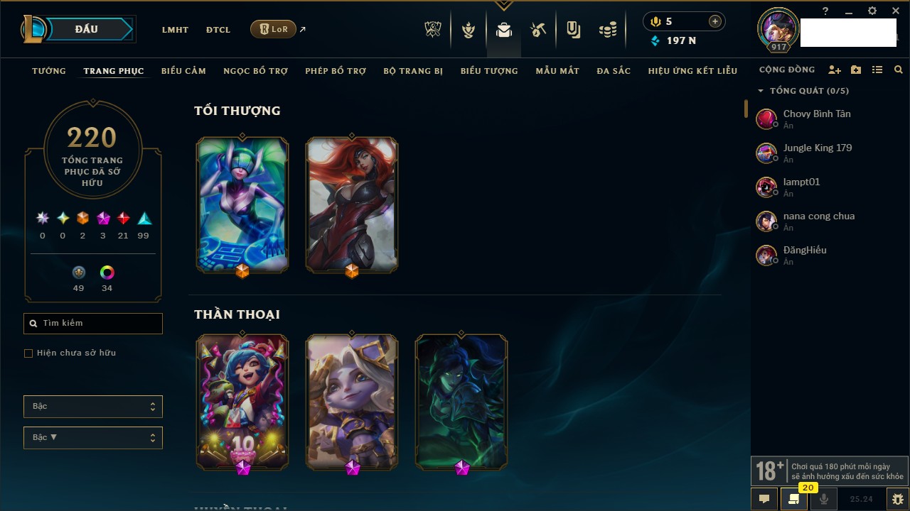 Rank Đơn: Chưa RankKhung: Chưa có khungTướng: 170 - Còn 42144 THXTrang Phục: 82Rank ĐTCL: Chưa RankLinh Thú: 130