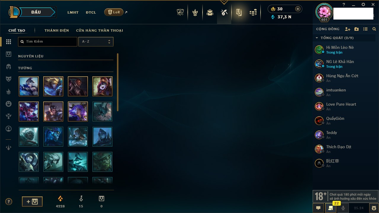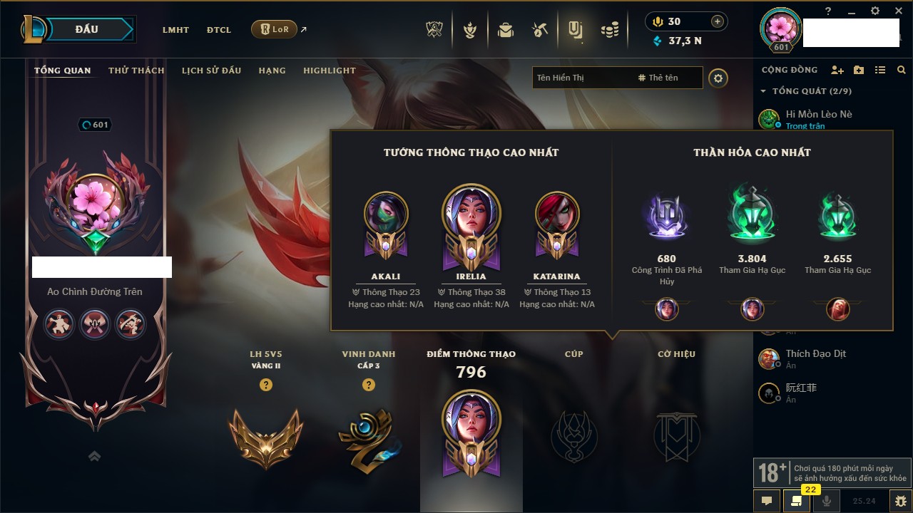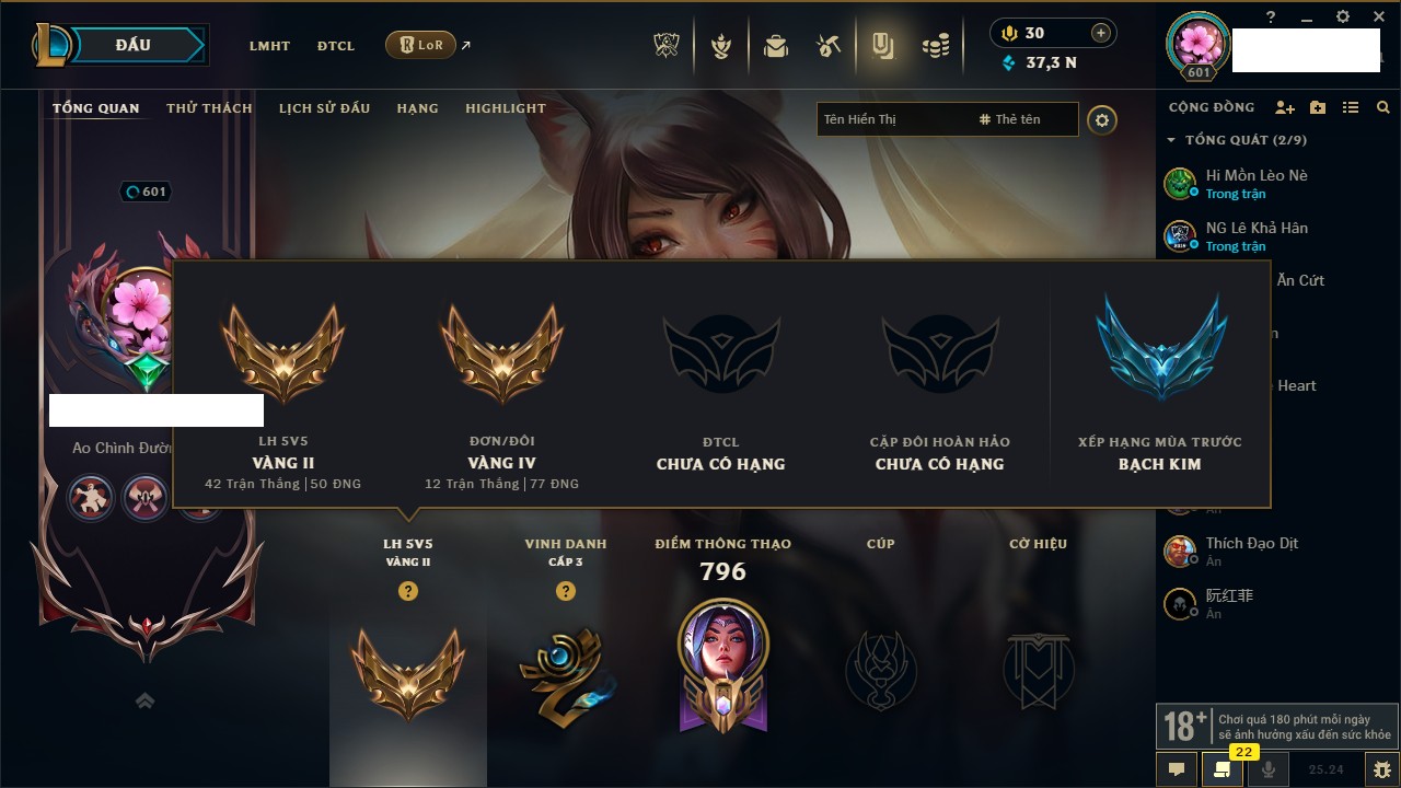 Rank Đơn: Chưa RankKhung: VàngTướng: 171 - Còn 37363 THXTrang Phục: 824Rank ĐTCL: Chưa RankLinh Thú: 371