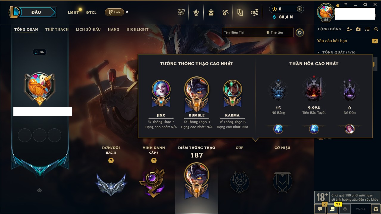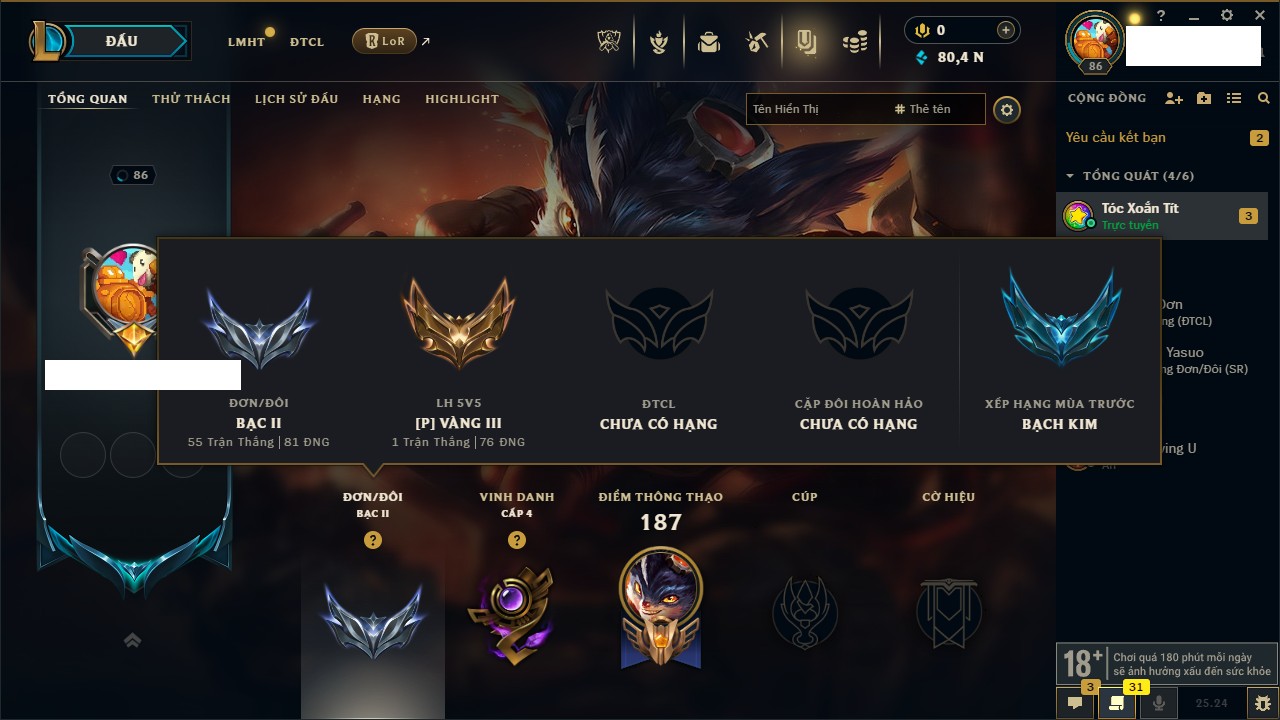 Rank Đơn: Chưa RankKhung: Chưa có khungTướng: 41 - Còn 11257 THXTrang Phục: 11Rank ĐTCL: Chưa RankLinh Thú: 84