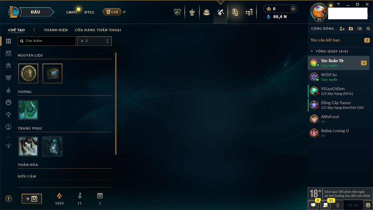 Rank Đơn: Chưa RankKhung: Chưa có khungTướng: 171 - Còn 827961 THXTrang Phục: 193Rank ĐTCL: Chưa RankLinh Thú: 63