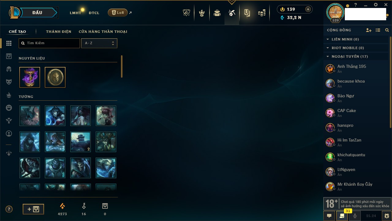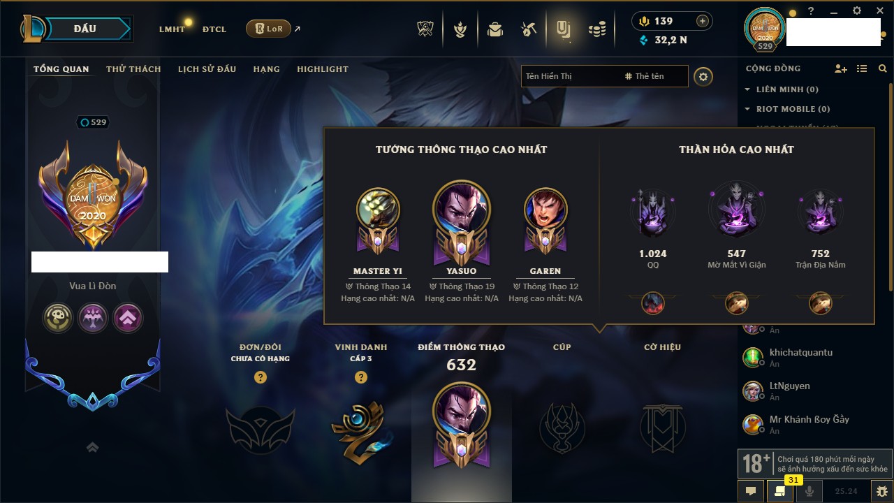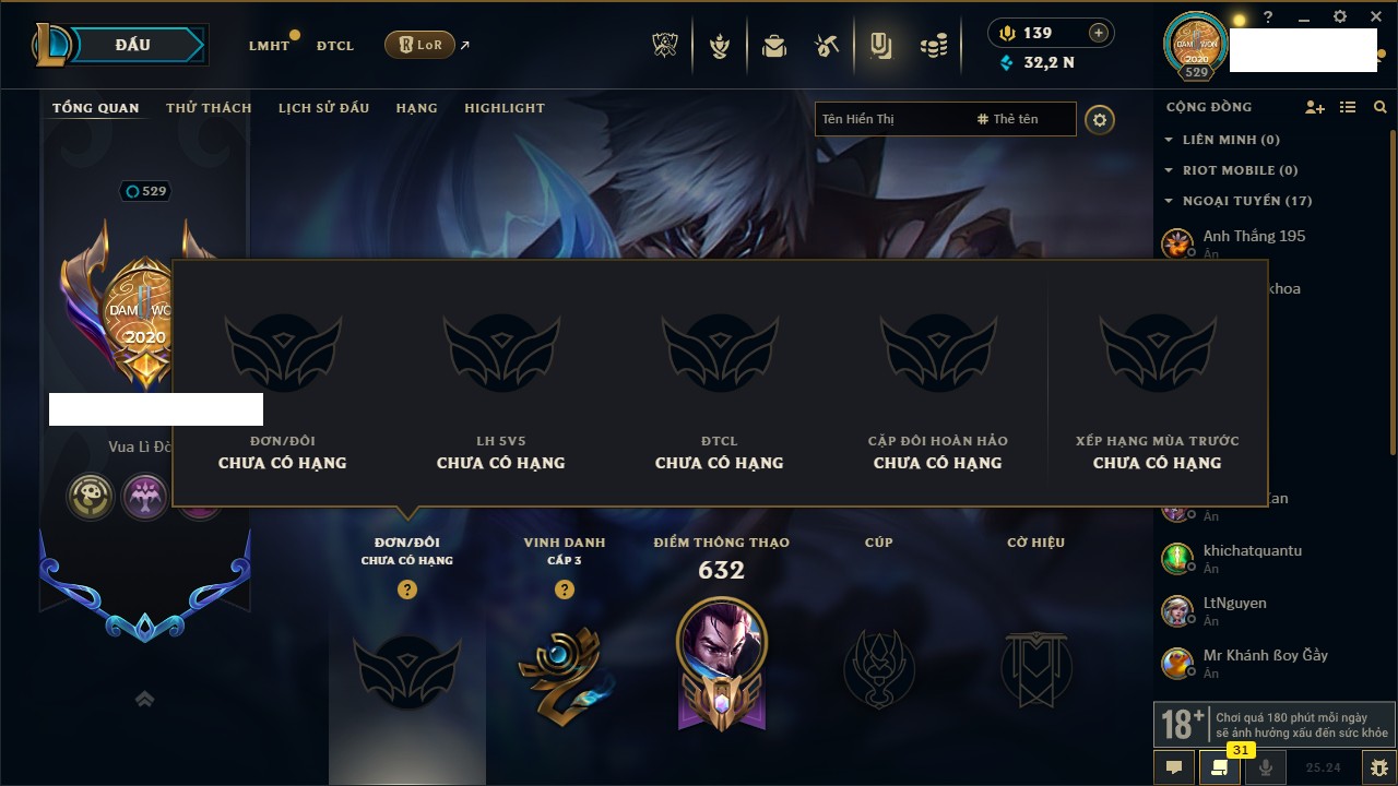 Rank Đơn: Chưa RankKhung: Chưa có khungTướng: 160 - Còn 21398 THXTrang Phục: 380Rank ĐTCL: Chưa RankLinh Thú: 27
