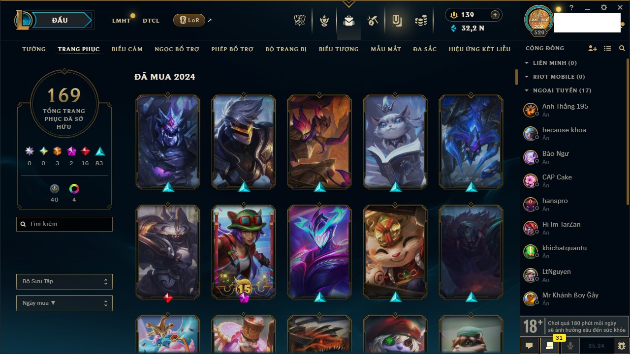 Rank Đơn: Chưa RankKhung: Chưa có khungTướng: 171 - Còn 75227 THXTrang Phục: 425Rank ĐTCL: Chưa RankLinh Thú: 201