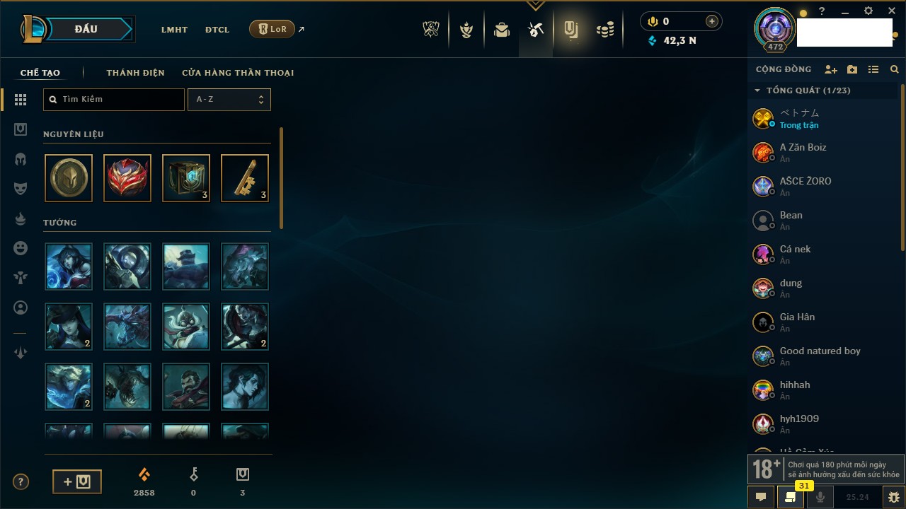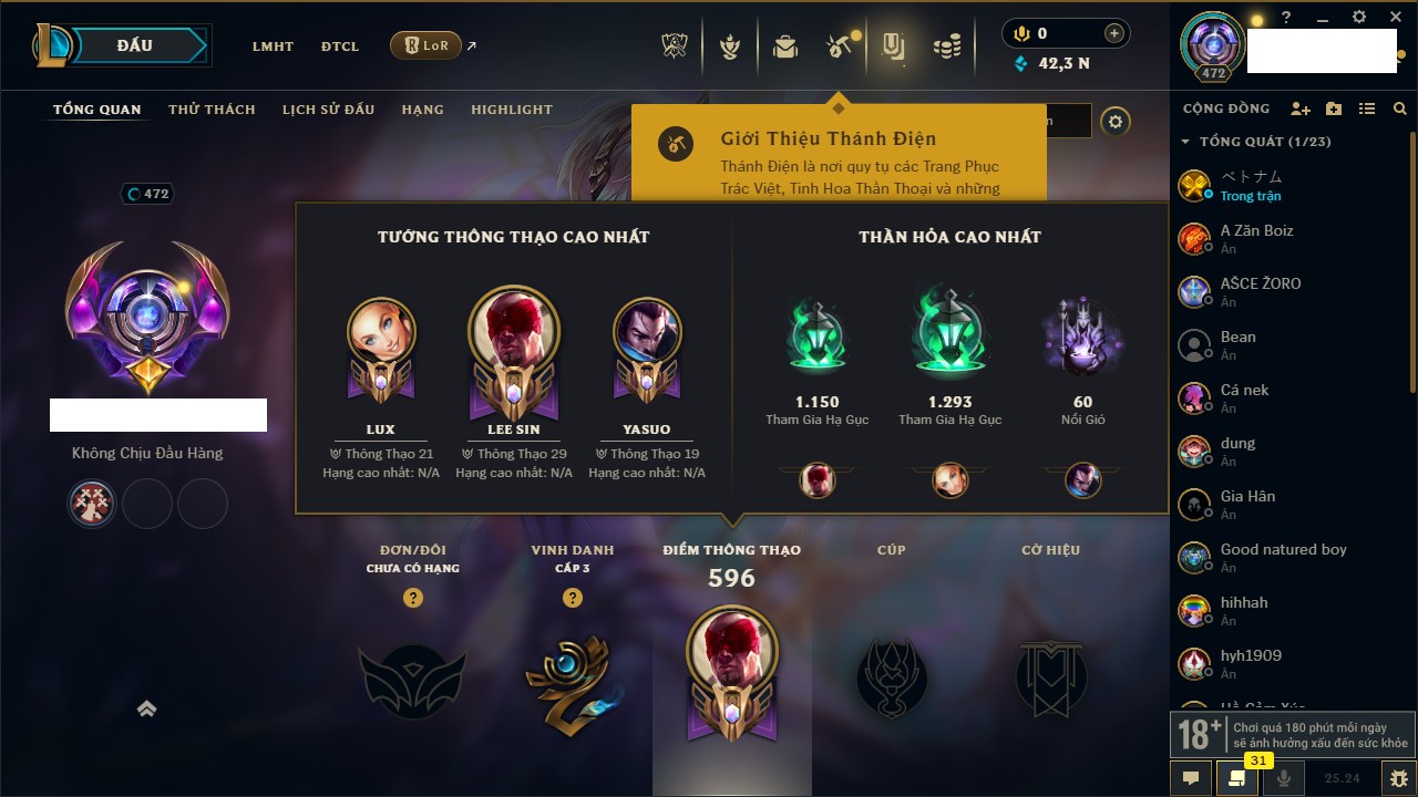 Rank Đơn: Chưa Rank Khung: Bạch kim Tướng: 170 - Còn 31547 THX Trang Phục: 197 Rank ĐTCL: Chưa Rank Linh Thú: 113