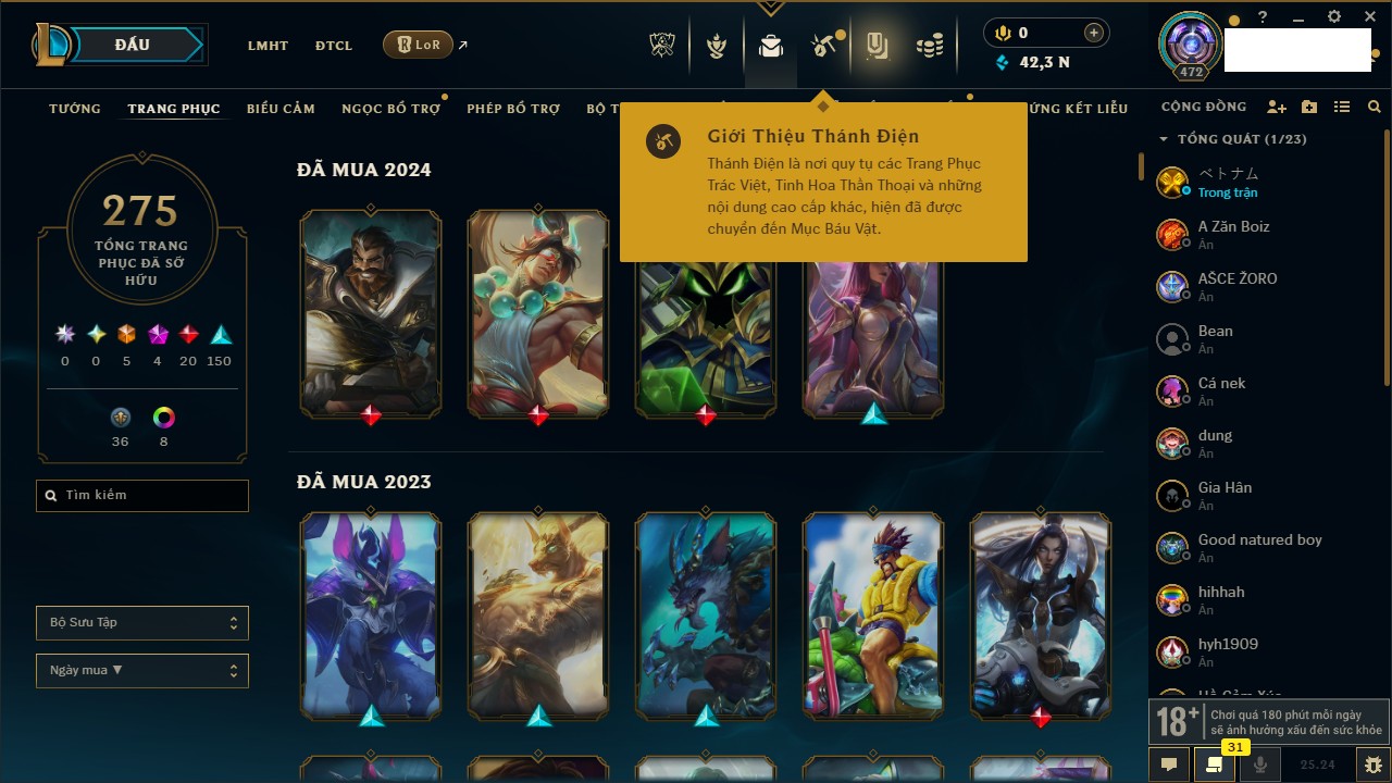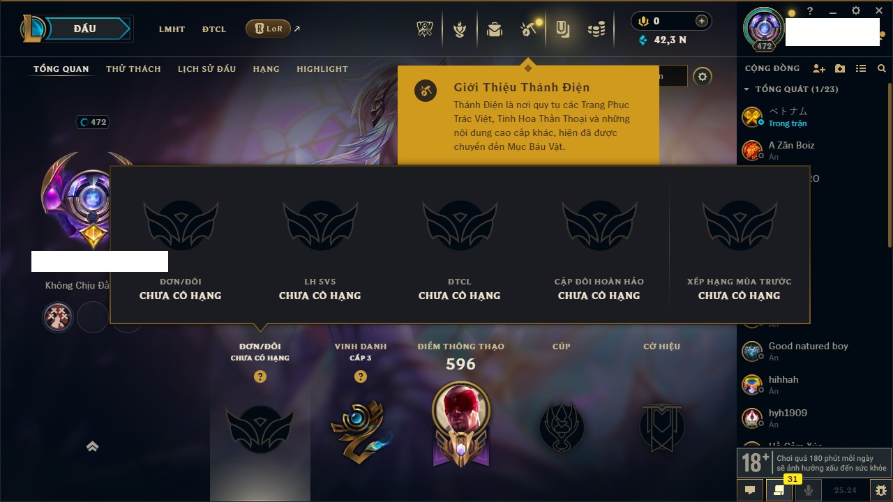 Rank Đơn: Chưa Rank Khung: Bạch kim Tướng: 145 - Còn 9448 THX Trang Phục: 62 Rank ĐTCL: Chưa Rank Linh Thú: 130