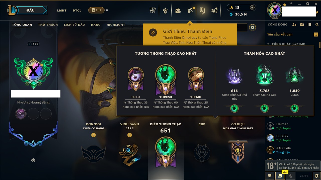 Rank Đơn: Chưa RankKhung: Bạch kimTướng: 172 - Còn 59200 THXTrang Phục: 471Rank ĐTCL: Bạch Kim IIILinh Thú: 114