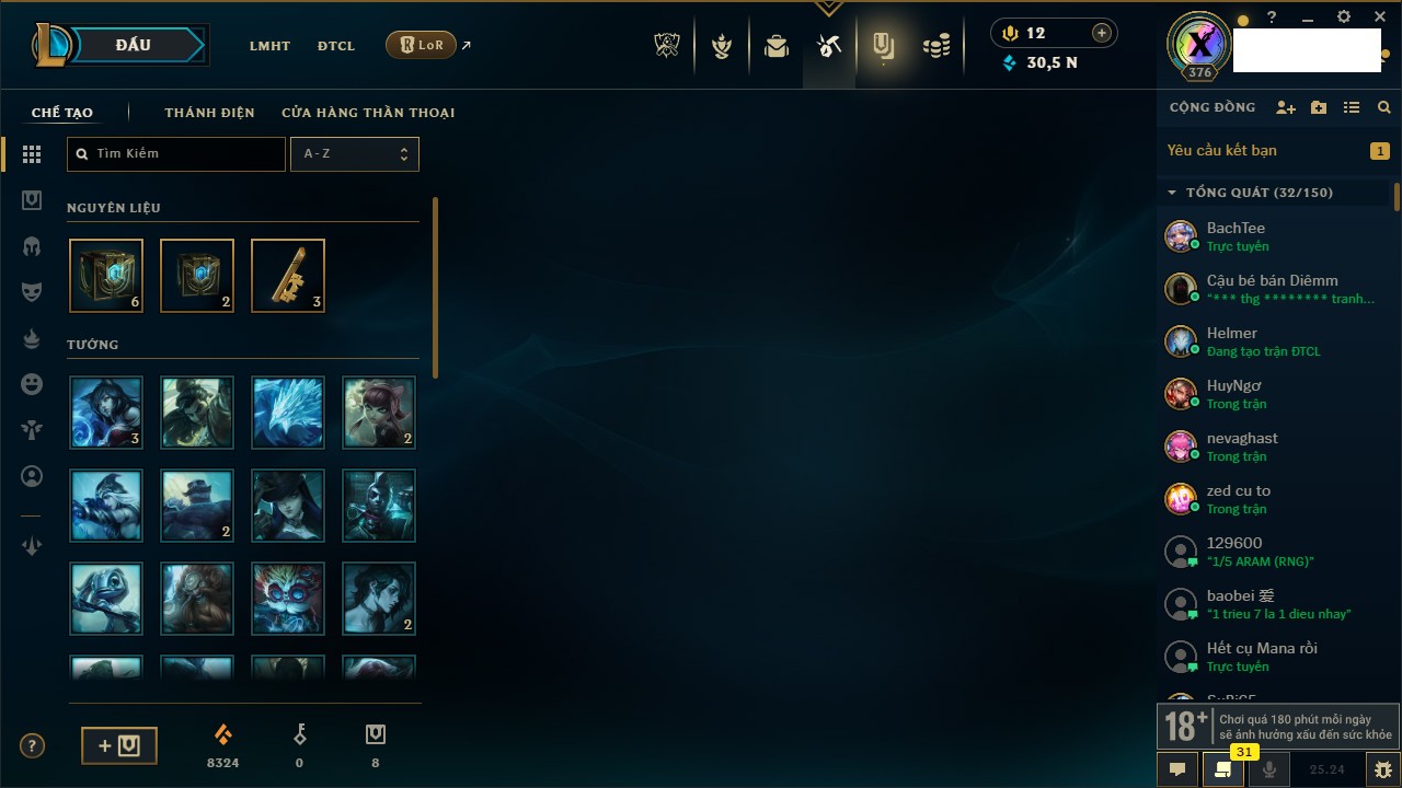 Rank Đơn: Chưa RankKhung: Chưa có khungTướng: 165 - Còn 79975 THXTrang Phục: 210Rank ĐTCL: Chưa RankLinh Thú: 149