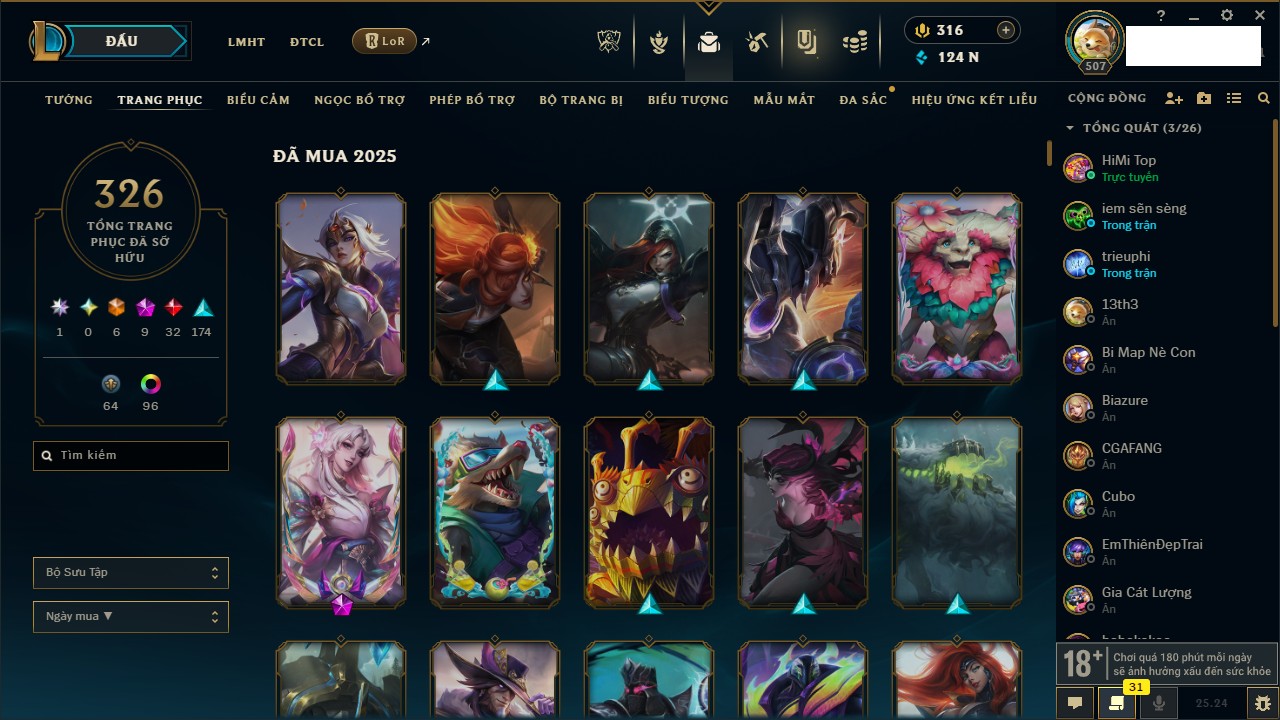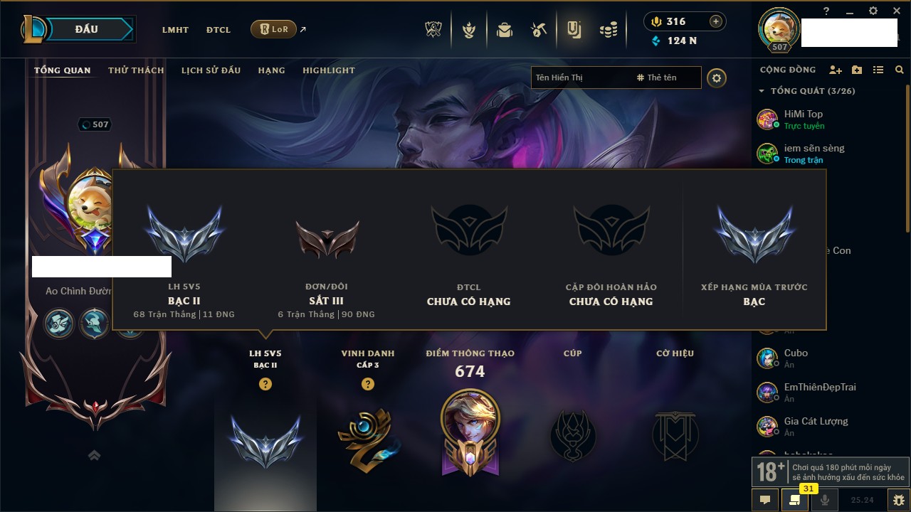 Rank Đơn: Chưa Rank Khung: Bạch kim Tướng: 145 - Còn 9448 THX Trang Phục: 62 Rank ĐTCL: Chưa Rank Linh Thú: 130