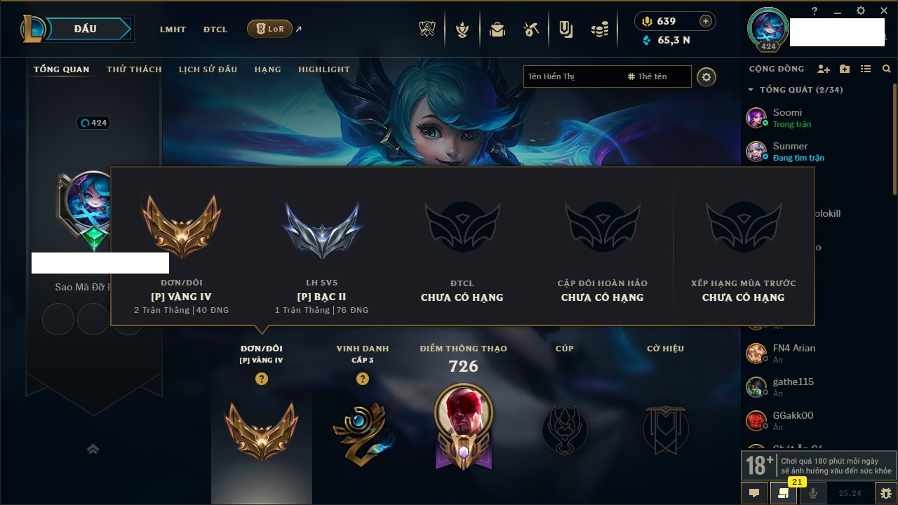 Rank Đơn: Chưa Rank Khung: Vàng Tướng: 126 - Còn 23055 THX Trang Phục: 114 Rank ĐTCL: Chưa Rank Linh Thú: 21