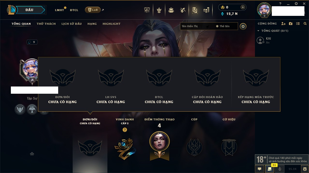 Rank Đơn: Bạch Kim III Khung: Chưa có khung Tướng: 172 - Còn 598 THX Trang Phục: 619 Rank ĐTCL: Vàng II Linh Thú: 224