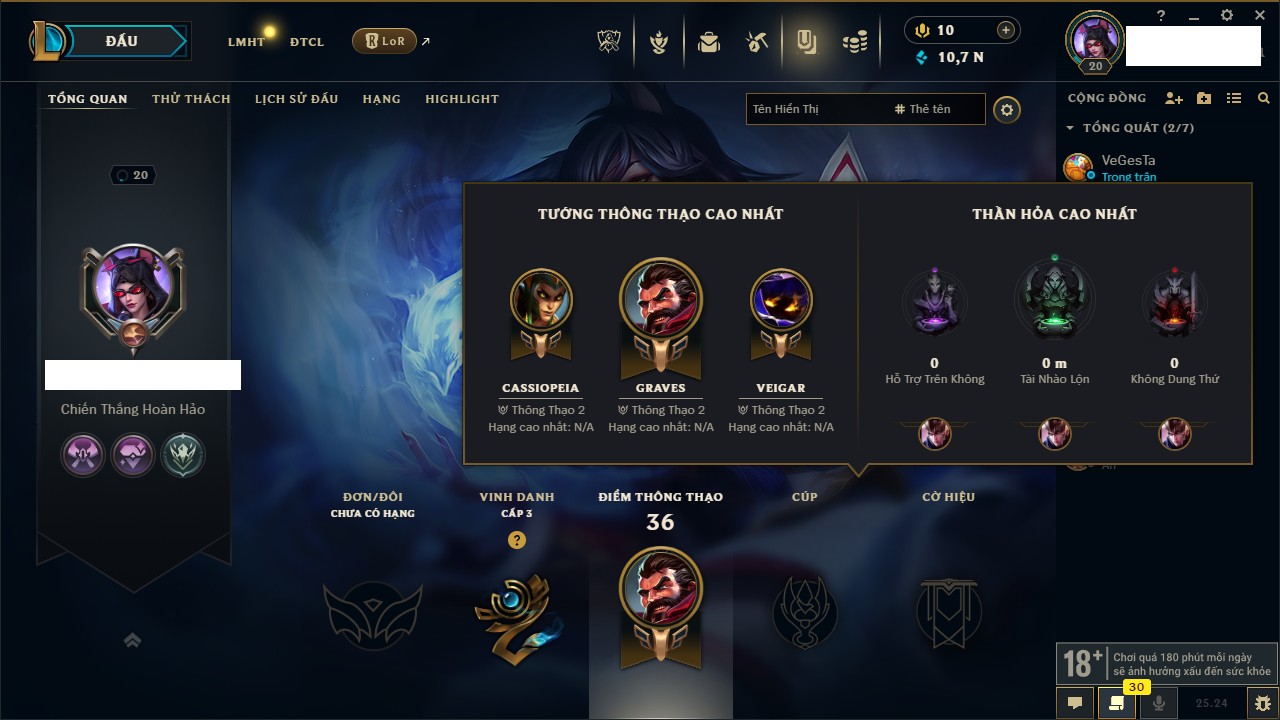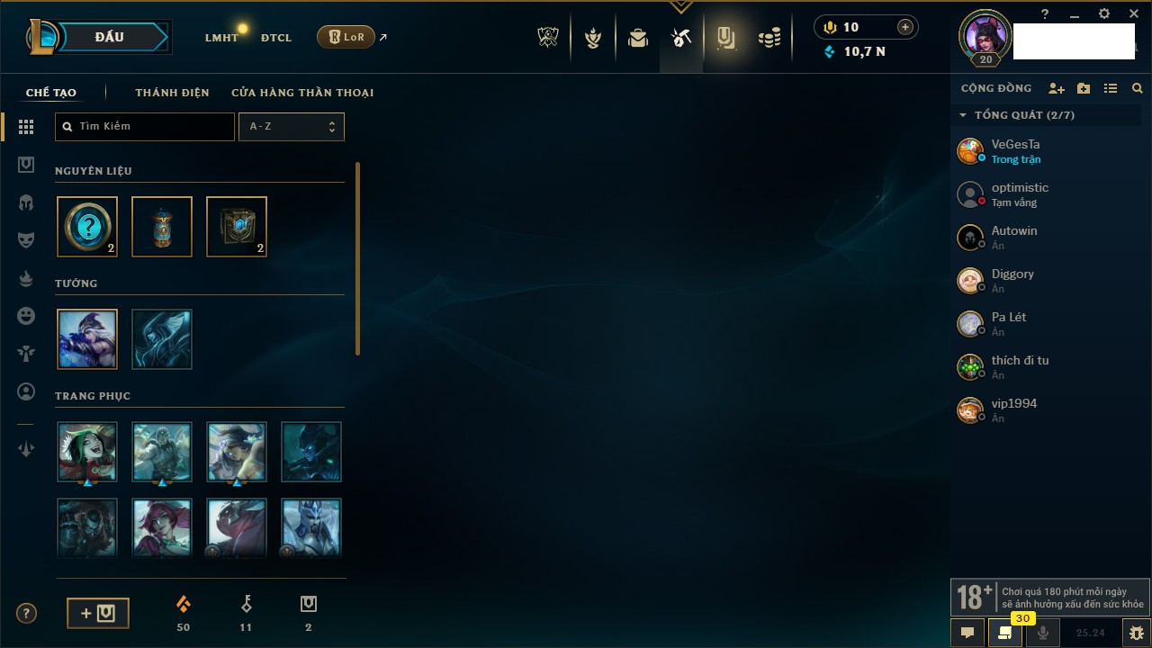 Rank Đơn: Chưa rank mùa nào Khung: Chưa có khung Tướng: 43 - Còn 10729 THX Trang Phục: 6 Rank ĐTCL: Chưa Rank Linh Thú: 225