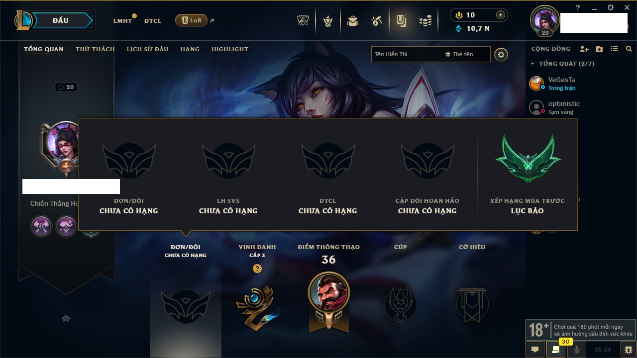 Rank Đơn: Bạch Kim III Khung: Bạch kim Tướng: 172 - Còn 76349 THX Trang Phục: 583 Rank ĐTCL: Chưa Rank Linh Thú: 278