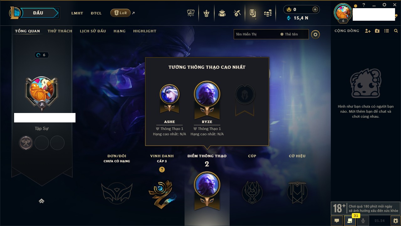 Rank Đơn: Chưa RankKhung: Bạch kimTướng: 172 - Còn 81 THXTrang Phục: 226Rank ĐTCL: Chưa RankLinh Thú: 193