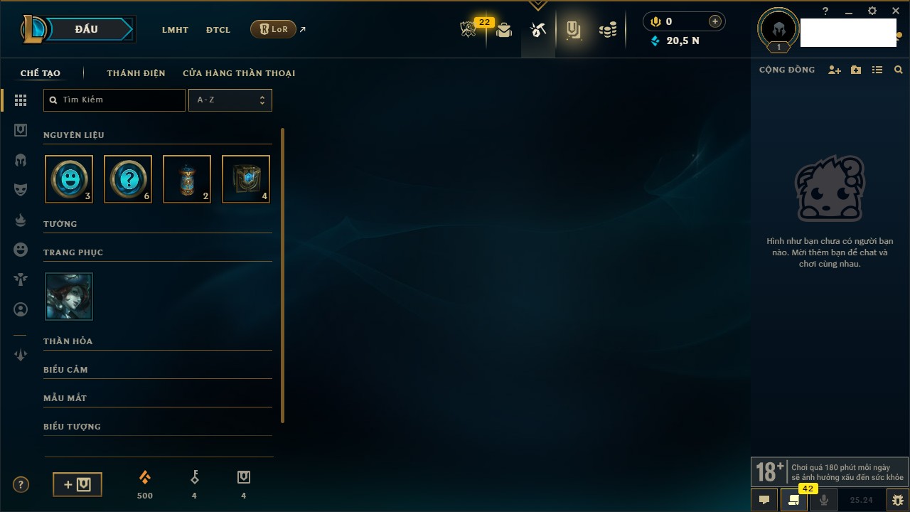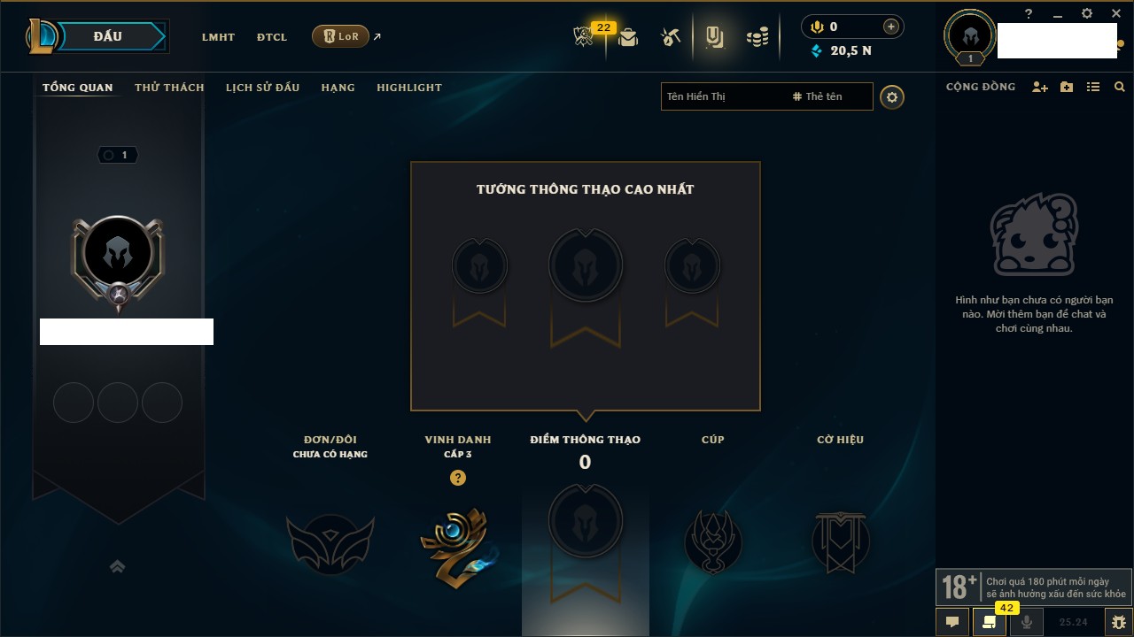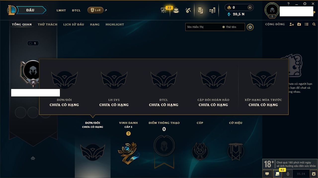 Rank Đơn: Chưa RankKhung: Bạch kimTướng: 172 - Còn 867 THXTrang Phục: 242Rank ĐTCL: Chưa RankLinh Thú: 162