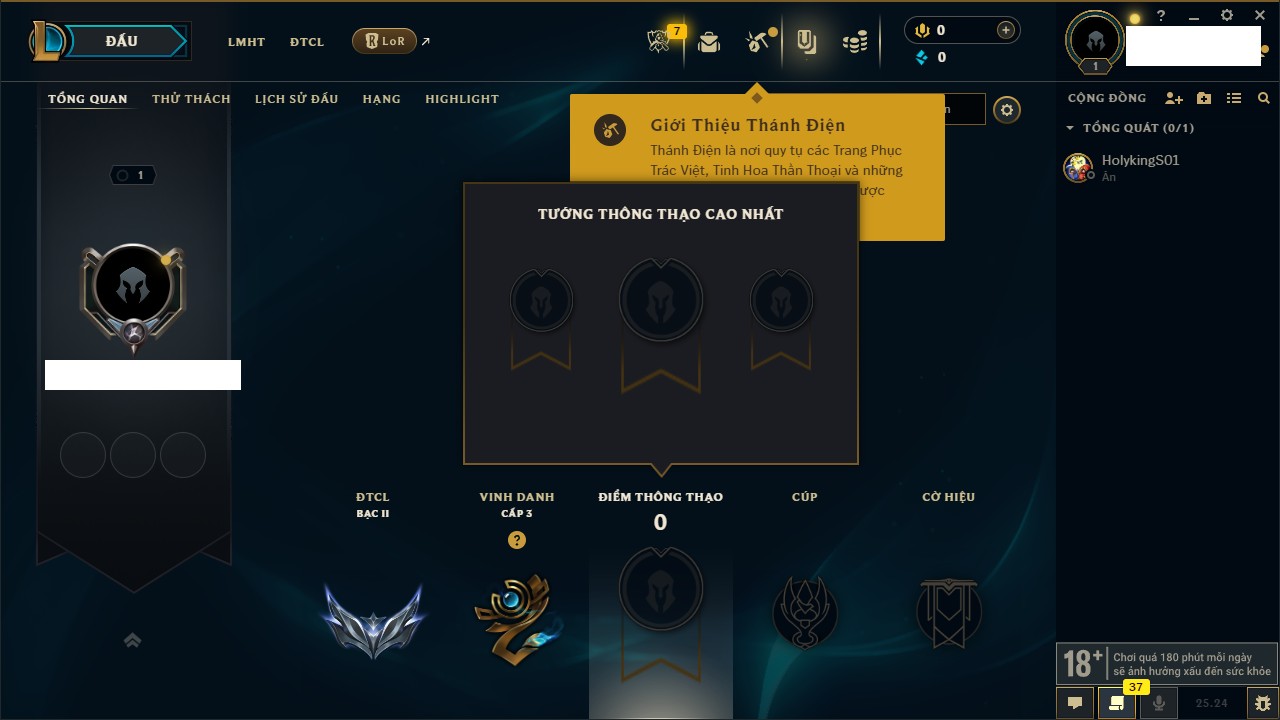Rank Đơn: Chưa rank mùa nàoKhung: Chưa có khungTướng: 3 - Còn 6770 THXTrang Phục: 0Rank ĐTCL: Chưa RankLinh Thú: 13