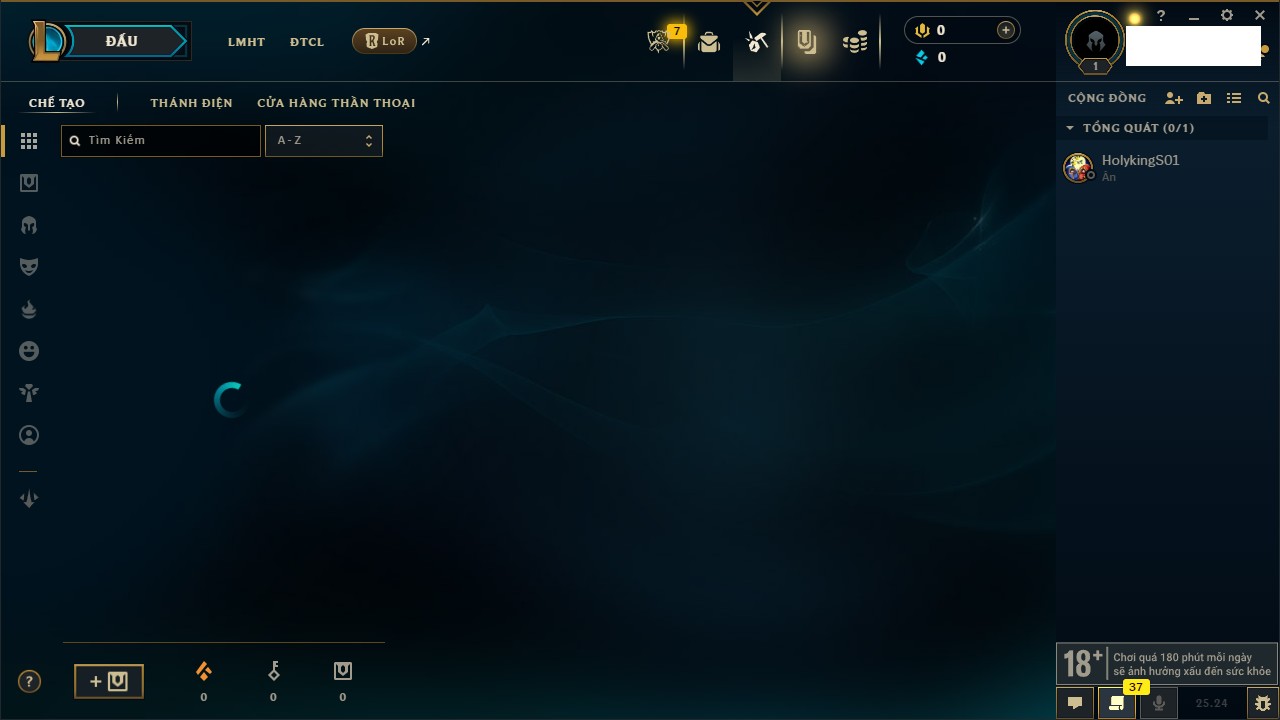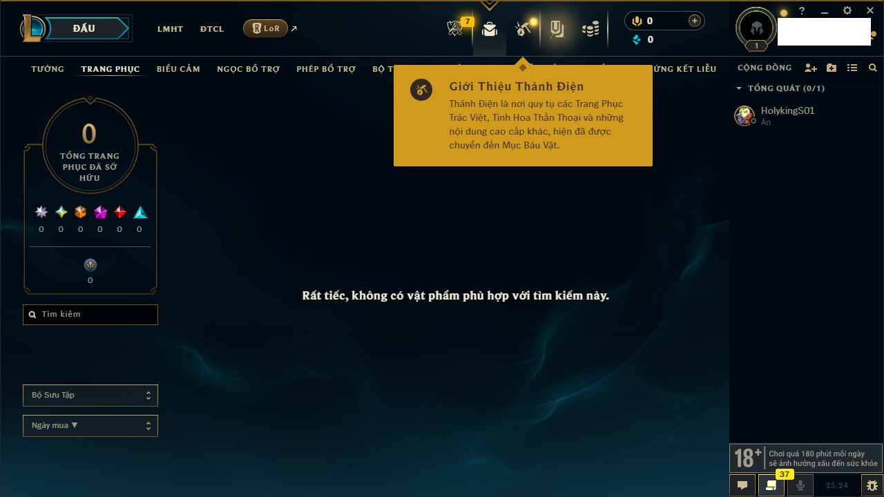 Rank Đơn: Chưa rank mùa nàoKhung: Chưa có khungTướng: 158 - Còn 7570 THXTrang Phục: 5Rank ĐTCL: Chưa RankLinh Thú: 45
