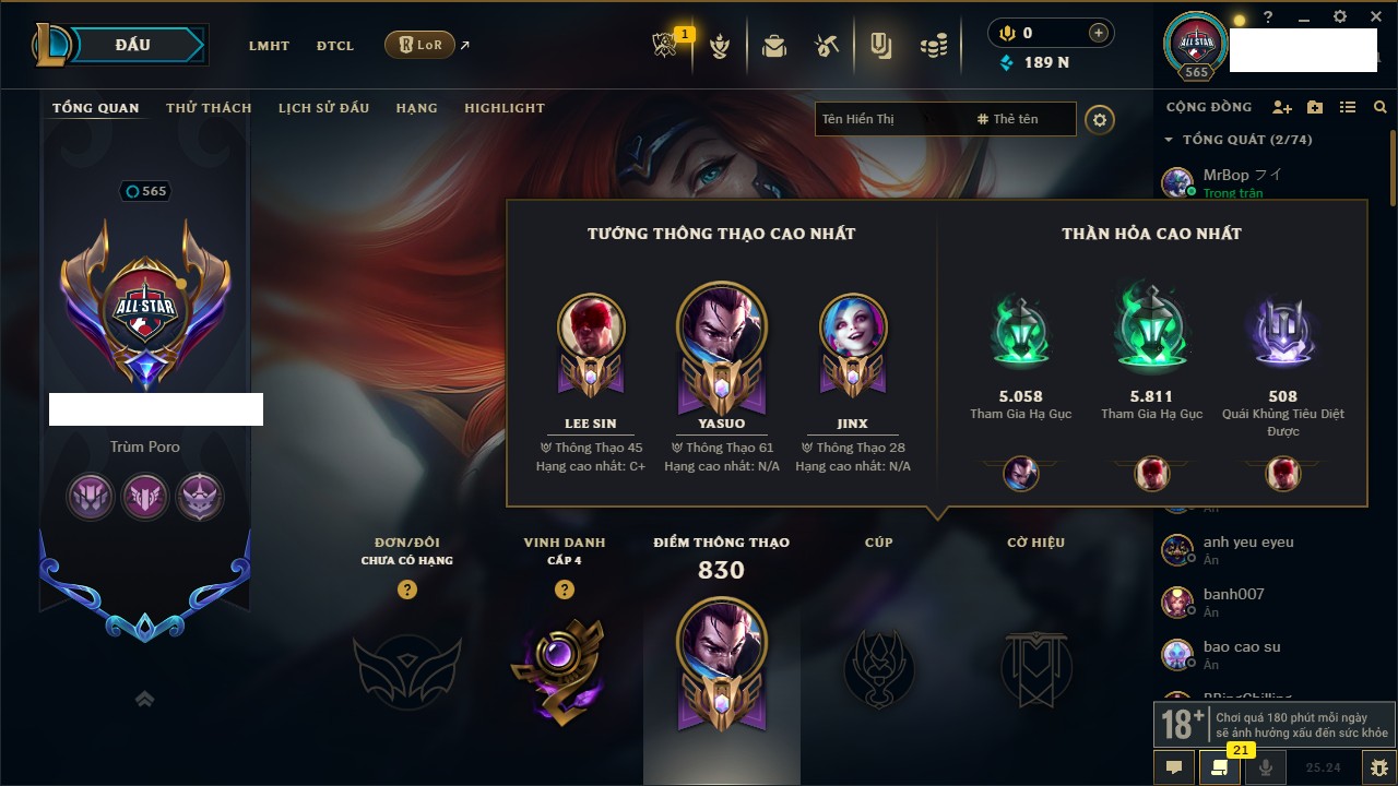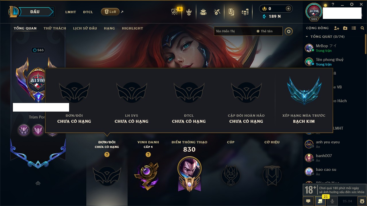Rank Đơn: Chưa RankKhung: Bạch kimTướng: 86 - Còn 1608 THXTrang Phục: 47Rank ĐTCL: Chưa RankLinh Thú: 58